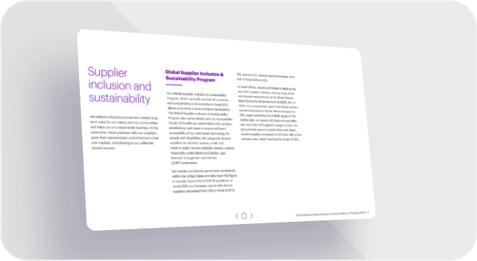 Global Supplier Inclusion & 19%, and our U.S. diverse spend decreased from Supplier Sustainability Program 34% in fiscal 2019 to 31%. In South Africa, we are committed to leading the inclusion and way with supplier inclusion, aiming to go above Our Global Supplier Inclusion & Sustainability and beyond requirements of the Broad-Based sustainability Program, which currently reaches 20 countries Black Economic Empowerment (B-BBEE) Act. In and is expanding to 24 countries in fiscal 2021, 2020, our procurement spend with black-women- allows us to drive a more inclusive marketplace. owned enterprises in South Africa increased to The Global Supplier Inclusion & Sustainability 39%, again exceeding the B-BBEE target of 12%. We believe inclusive procurement creates long- Program also works closely with our Accessibility Additionally, our spend with black-owned-SMEs term value for our clients and our communities Center of Excellence, stakeholders and vendors, was more than 52% against a target of 30%. Our and helps us run a responsible business. At the establishing road maps to ensure sufficient procurement spend in South Africa with black- same time, these practices help our suppliers accessibility of our web-based technology for owned suppliers increased to 47% from 39% in the grow their representation and influence in their people with disabilities. We categorize diverse previous year, nearly reaching the target of 50%. own markets, contributing to our collective suppliers as minority, women, small- and shared success. medium-sized, service-disabled veteran, veteran, historically underutilized and lesbian, gay, bisexual, transgender and intersex (LGBTI) enterprises. We monitor our diverse spend most consistently within the United States and also track this figure in Canada. Due to the COVID-19 pandemic, in fiscal 2020, our Canadian spend with diverse suppliers decreased from 25% in fiscal 2019 to United Nations Global Compact: Communication on Progress 2020 | 47