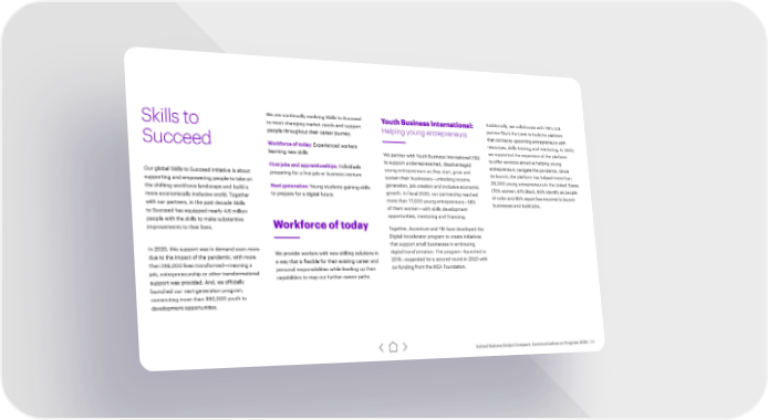 We are continually evolving Skills to Succeed Youth Business International: Additionally, we collaborate with YBI’s U.S. Skills to to meet changing market needs and support Helping young entrepreneurs partner Sky’s the Limit to build its platform people throughout their career journey: that connects upcoming entrepreneurs with Succeed Workforce of today: Experienced workers resources, skills training and mentoring. In 2020, We partner with Youth Business International (YBI) we supported the expansion of the platform learning new skills to offer services aimed at helping young to support underrepresented, disadvantaged entrepreneurs navigate the pandemic. Since First jobs and apprenticeships: Individuals young entrepreneurs as they start, grow and Our global Skills to Succeed initiative is about preparing for a first job or business venture sustain their businesses—unlocking income its launch, the platform has helped more than supporting and empowering people to take on generation, job creation and inclusive economic 30,000 young entrepreneurs in the United States the shifting workforce landscape and build a Next generation: Young students gaining skills (70% women, 61% Black, 80% identify as people more economically inclusive world. Together to prepare for a digital future growth. In fiscal 2020, our partnership reached of color and 85% report low income) to launch with our partners, in the past decade Skills more than 77,000 young entrepreneurs—58% businesses and build jobs. to Succeed has equipped nearly 4.6 million of them women—with skills development people with the skills to make substantive Workforce of today opportunities, mentoring and financing. improvements to their lives. Together, Accenture and YBI have developed the Digital Accelerator program to create initiatives In 2020, this support was in demand even more that support small businesses in embracing due to the impact of the pandemic, with more We provide workers with new skilling solutions in digital transformation. The program—launched in than 246,000 lives transformed—meaning a a way that is flexible for their existing career and 2018—expanded for a second round in 2020 with job, entrepreneurship or other transformational personal responsibilities while leveling up their co-funding from the IKEA Foundation. support was provided. And, we officially capabilities to map out further career paths. launched our next-generation program, connecting more than 390,000 youth to development opportunities. United Nations Global Compact: Communication on Progress 2020 | 26