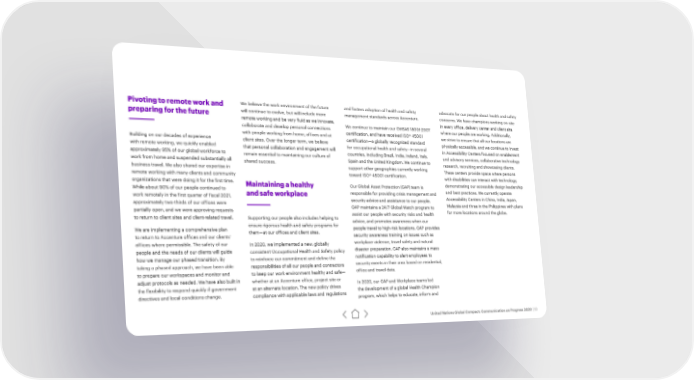 Pivoting to remote work and We believe the work environment of the future and fosters adoption of health and safety advocate for our people about health and safety wil management standards across Accenture. preparing for the future l continue to evolve, but will include more concerns. We have champions working on-site remote working and be very fluid as we innovate, We continue to maintain our OHSAS 18001:2007 in every office, delivery center and client site collaborate and develop personal connections certification, and have received ISO® 45001 where our people are working. Additionally, with people working from home, offices and at certification—a globally recognized standard we strive to ensure that all our locations are Building on our decades of experience client sites. Over the longer term, we believe physically accessible, and we continue to invest with remote working, we quickly enabled that personal collaboration and engagement will for occupational health and safety—in several in Accessibility Centers focused on enablement approximately 95% of our global workforce to remain essential to maintaining our culture of countries, including Brazil, India, Ireland, Italy, and advisory services, collaborative technology work from home and suspended substantially all shared success. Spain and the United Kingdom. We continue to research, recruiting and showcasing clients. business travel. We also shared our expertise in support other geographies currently working These centers provide space where persons remote working with many clients and community toward ISO® 45001 certification. with disabilities can interact with technology, organizations that were doing it for the first time. Maintaining a healthy Our Global Asset Protection (GAP) team is demonstrating our accessible design leadership While about 90% of our people continued to and safe workplace responsible for providing crisis management and and best practices. We currently operate work remotely in the first quarter of fiscal 2021, security advice and assistance to our people. Accessibility Centers in China, India, Japan, approximately two-thirds of our offices were GAP maintains a 24/7 Global Watch program to Malaysia and three in the Philippines with plans partially open, and we were approving requests assist our people with security risks and health for more locations around the globe. to return to client sites and client-related travel. Supporting our people also includes helping to advice, and promotes awareness when our We are implementing a comprehensive plan ensure rigorous health and safety programs for people travel to high-risk locations. GAP provides to re them—at our offices and client sites. security awareness training on issues such as turn to Accenture offices and our clients’ offices where permissible. The safety of our In 2020, we implemented a new, globally workplace violence, travel safety and natural people and the needs of our clients will guide consistent Occupational Health and Safety policy disaster preparation. GAP also maintains a mass how we manage our phased transition. By to reinforce our commitment and define the notification capability to alert employees to taking a phased approach, we have been able responsibilities of all our people and contractors security events in their area based on residential, to prepare our workspaces and monitor and to keep our work environment healthy and safe— office and travel data. adjust protocols as needed. We have also built in whether at an Accenture office, project site or In 2020, our GAP and Workplace teams led the flexibility to respond quickly if government at an alternate location. The new policy drives the development of a global Health Champion directives and local conditions change. compliance with applicable laws and regulations program, which helps to educate, inform and United Nations Global Compact: Communication on Progress 2020 | 13