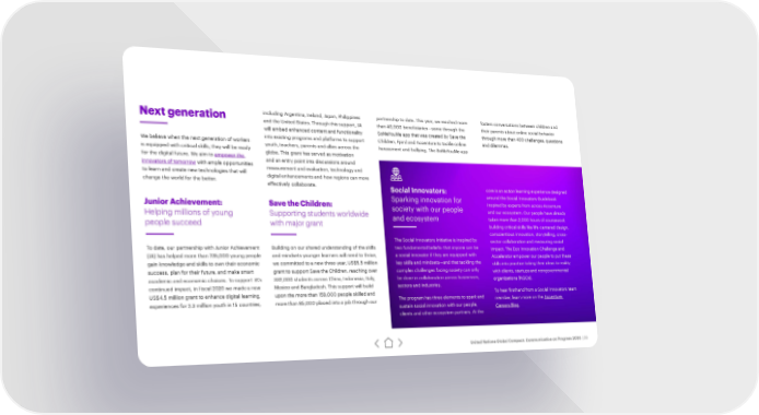 Next generation including Argentina, Ireland, Japan, Philippines partnership to date. This year, we reached more fosters conversations between children and and the United States. Through this support, JA than 40,000 beneficiaries—some through the their parents about online social behavior will embed enhanced content and functionality SoMeYouMe app that was created by Save the through more than 400 challenges, questions We believe when the next generation of workers into existing programs and platforms to support Children, Fjord and Accenture to tackle online and dilemmas. is equipped with critical skills, they will be ready youth, teachers, parents and allies across the harassment and bullying. The SoMeYouMe app for the digital future. We aim to empower the globe. This grant has served as motivation innovators of tomorrow with ample opportunities and an entry point into discussions around to learn and create new technologies that will measurement and evaluation, technology and change the world for the better. digital enhancements and how regions can more effectively collaborate. Social Innovators: core is an action learning experience designed Sparking innovation for around the Social Innovators Guidebook Junior Achievement: Save the Children: society with our people inspired by experts from across Accenture Helping millions of young Supporting students worldwide and our ecosystem. Our people have already people succeed with major grant and ecosystem taken more than 2,000 hours of coursework building critical skills like life-centered design, conscientious innovation, storytelling, cross- The Social Innovators initiative is inspired by sector collaboration and measuring social To date, our partnership with Junior Achievement Building on our shared understanding of the skills two fundamental beliefs: that anyone can be impact. The Eco Innovation Challenge and (JA) has helped more than 735,000 young people and mindsets younger learners will need to thrive, a social innovator if they are equipped with Accelerator empower our people to put these gain knowledge and skills to own their economic we committed to a new three-year, US$5.5 million key skills and mindsets —and that tackling the skills into practice taking their ideas to reality success, plan for their future, and make smart grant to support Save the Children, reaching over complex challenges facing society can only with clients, startups and nongovernmental academic and economic choices. To support JA’s 332,000 students across China, Indonesia, Italy, be done in collaboration across businesses, organizations (NGOs). continued impact, in fiscal 2020 we made a new Mexico and Bangladesh. This support will build sectors and industries. US$4.5 million grant to enhance digital learning upon the more than 159,000 people skilled and To hear firsthand from a Social Innovators team experiences for 2.3 million youth in 15 countries, more than 85,000 placed into a job through our The program has three elements to spark and member, learn more on the Accenture sustain social innovation with our people, Careers Blog. clients and other ecosystem partners. At the United Nations Global Compact: Communication on Progress 2020 | 29