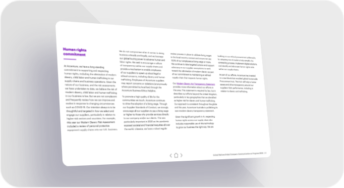 Human rights We do not compromise when it comes to doing review process in place to validate living wages building on our ethical procurement philosophy commitment business ethically and legally, and we leverage in the local country context and ensure we pay by adopting new AI tools to help simplify the our global buying power to advance human and 100% of our employees a living wage or more. contracting process, implement digital solutions, labor rights. We seek to encourage a culture We continue to take targeted actions and support and identify and eliminate human rights risks of transparency within our supply chains and advocacy in our supplier ecosystems to work within our supply chains. At Accenture, we have a long-standing provide a mechanism to enable employees toward the elimination of modern slavery as part commitment to supporting and respecting of our suppliers to speak up about legal or of our commitment to maintaining an ethical As part of our efforts, Accenture has invested human rights, including the elimination of modern ethical concerns, including slavery and human supply chain that respects human rights. in a new blockchain-enabled global Sustainable slavery, child labor and human trafficking in our trafficking. Employees of Accenture suppliers Procurement Hub. This Hub will help to better Modern Slavery Act Transparency Statement supply chains and business operations. Given the may report concerns or violations (anonymously Our assess and drive transparency around our nature of our business, and the risk assessments where permitted by local law) through the provides more information about our efforts in suppliers’ ESG performance, including in we have undertaken to date, we believe the risk of Accenture Business Ethics Helpline. this area. This statement is required by law, but it relation to slavery and trafficking. modern slavery, child labor and human trafficking describes our efforts beyond the United Kingdom, in our business is low. But we are not complacent To promote a high quality of life for the particularly in key geographies that we identified and frequently review how we can improve and communities we touch, Accenture continues as higher risk for slavery and human trafficking. evolve in response to changing circumstances to drive the adoption of a living wage. Through Our approach is consistent throughout the globe such as COVID-19. Our intention always is to be our Supplier Standards of Conduct, we strongly and this year, Accenture Australia is publishing its thoughtful and targeted in how we select and encourage all our suppliers to pay a living wage own modern slavery transparency statement. engage our suppliers, particularly in relation to or higher to those who provide services directly higher-risk sectors and countries. For example, to our company and/or our clients. This was Given the significant growth in AI, respecting this year our Modern Slavery Risk Assessment particularly important in 2020 as the pandemic human rights across our supply chain also included a review of personal protective exposed societal and financial inequities all over includes responsible use of this technology equipment supply chains into our U.K. business. the world. Likewise, we have a robust regular to grow our business the right way. We are United Nations Global Compact: Communication on Progress 2020 | 44