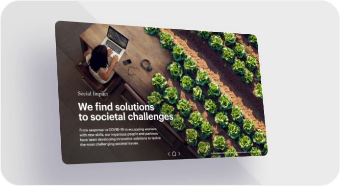 Social Impact We find solutions to societal challenges From response to COVID-19 to equipping workers with new skills, our ingenious people and partners have been developing innovative solutions to tackle the most challenging societal issues. United Nations Global Compact: Communication on Progress 2020 | 21