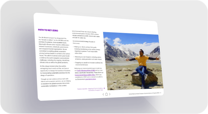 PATH TO NET-ZERO we announced three new industry-leading environmental goals in October 2020: achieve net-zero emissions by 2025, move to zero waste The UN Global Compact has designated this and plan for water risk. the “decade to deliver” on the UN SDGs and the Our environmental strategy focuses on promise of a greener, more equitable future. three areas: Meaningful climate action requires collaboration between businesses, individuals, governments • Helping our clients achieve their goals, and nongovernmental organizations. We are including transitioning to low-carbon energy, committed to enabling global cooperation migrating to greener IT and responsible among business leaders to achieve a low-carbon value chains future. The calls for business action grew louder • Reducing our own footprint, including carbon in 2020 as the world navigated unprecedented emissions, waste generation and water impact challenges, including the ongoing, intensifying climate crisis as well as the global pandemic. • Engaging our people to innovate to address key environmental issues At this unique moment when the world is reimagining how to work and live, we have an Reducing our environmental impact is built into opportunity to change the business of business our Code of Business Ethics (COBE) and our core by incorporating sustainable practices into the values, specifically Stewardship. These inform our design of operations. Environmental Responsibility Policy, which was established in 2007 and is reviewed annually by Through our own actions and our work with our Environment governance group. clients and ecosystem partners, we are helping to transform the global economy into a more sustainable marketplace. In this context, Prashant, Specialist – Marketing & Communications, Art Direction, Gurugram, India United Nations Global Compact: Communication on Progress 2020 | 34