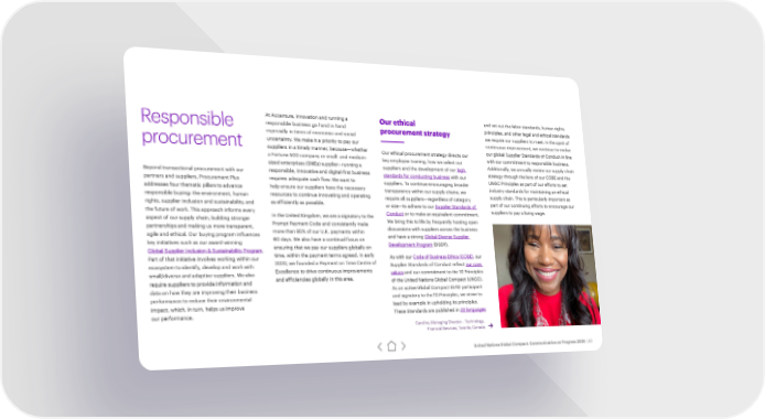 At Accenture, innovation and running a Our ethical and set out the labor standards, human rights Responsible responsible business go hand in hand procurement strategy principles, and other legal and ethical standards especially in times of economic and social we require our suppliers to meet. In the spirit of procurement uncertainty. We make it a priority to pay our continuous improvement, we continue to evolve suppliers in a timely manner, because—whether Our ethical procurement strategy directs our our global Supplier Standards of Conduct in line a Fortune 500 company or small- and medium- key employee training, how we select our with our commitment to responsible business. sized enterprises (SMEs) supplier—running a suppliers and the development of our high Additionally, we annually review our supply chain Beyond transactional procurement with our responsible, innovative and digital-first business standards for conducting business with our strategy through the lens of our COBE and the partners and suppliers, Procurement Plus requires adequate cash flow. We want to suppliers. To continue encouraging broader UNGC Principles as part of our efforts to set addresses four thematic pillars to advance help ensure our suppliers have the necessary transparency within our supply chains, we industry standards for maintaining an ethical responsible buying: the environment, human resources to continue innovating and operating require all suppliers—regardless of category supply chain. This is particularly important as rights, supplier inclusion and sustainability, and as efficiently as possible. Supplier Standards of part of our continuing efforts to encourage our or size—to adhere to our the future of work. This approach informs every Conduct or to make an equivalent commitment. suppliers to pay a living wage. aspect of our supply chain, building stronger In the United Kingdom, we are a signatory to the We bring this to life by frequently hosting open partnerships and making us more transparent, Prompt Payment Code and consistently make discussions with suppliers across the business agile and ethical. Our buying program influences more than 95% of our U.K. payments within and have a strong Global Diverse Supplier key initiatives such as our award-winning 60 days. We also have a continual focus on Development Program (DSDP). Global Supplier Inclusion & Sustainability Program. ensuring that we pay our suppliers globally on Part of that initiative involves working within our time, within the payment terms agreed. In early As with our Code of Business Ethics (COBE), our ecosystem to identify, develop and work with 2020, we founded a Payment on Time Centre of Supplier Standards of Conduct reflect our core small/diverse and adaptive suppliers. We also Excellence to drive continuous improvements values and our commitment to the 10 Principles require suppliers to provide information and and efficiencies globally in this area. of the United Nations Global Compact (UNGC). data on how they are improving their business As an active Global Compact LEAD participant performance to reduce their environmental and signatory to the 10 Principles, we strive to impact, which, in turn, helps us improve lead by example in upholding its principles. our performance. These Standards are published in 20 languages Caroline, Managing Director – Technology, Financial Services, Toronto, Canada United Nations Global Compact: Communication on Progress 2020 | 43