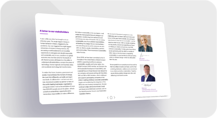 A letter to our stakeholders We believe sustainability is the new digital—it will We are proud of Accenture’s progress in a very create the most powerful force of change in our challenging year, but there is still much more work generation, transforming how we live and work to do. As this report demonstrates, we continue to A year unlike any other has brought us to an and driving new value and growth. We are making raise the bar for what we can accomplish—and the inflection point. The single biggest change in sustainability one of our greatest responsibilities, speed at which we act. With our people remaining human behavior in history, triggered by the embedding it by design into our core business— our top priority, we are now expanding our focus pandemic, has now triggered the single biggest into everything we do and for everyone we work on helping our clients and partners more fully reinvention of industry in living memory. We with: our clients, people, shareholders, partners embrace sustainability. To help guide these efforts, are seeing a world awakened to an incredible and communities. This is Accenture’s Sustainability we are partnering with the UNGC on studies of opportunity to reimagine and rebuild responsibly Value Promise. CEOs’ views on two key issues—progressing and sustainably, and, in turn, transform our global sustainability in a post-pandemic world and taking economy into one that works for the benefit of Since 2008, we have been committed to the 10 action on climate change—which we will publish Julie Sweet all. Shared success will depend on the ability to Principles of the United Nations Global Compact later this year. Chief Executive Officer understand all stakeholders; connect the power of (UNGC), supporting its efforts to advance technology, human ingenuity and business value; sustainability, equality and human rights. As a We are grateful to our people around the world for and accelerate technology-led transformation. Global Compact LEAD member, we champion the their boundless humanity and heart, and for their UN Sustainable Development Goals (SDGs), with unstinting dedication, resilience and commitment To realize this future, business, government and a special focus on those that are most relevant for to our clients and all our stakeholders. Together, society must embrace this moment of change. our company, and we are working with the UNGC, we are driving positive change every day—and We must think differently, act boldly and reach SAP and 3M on SDG Ambition, which challenges delivering true shared success. new levels of collaboration—and we must do it and supports participating companies of the now. Accenture’s position as partner to many of UNGC in setting ambitious corporate sustainability the world’s leading businesses, organizations targets and accelerating the integration of the and governments—and as the workplace of more SDGs into core business management. We also than 500,000 people around the globe—affords continue to align with Environmental, Social us both an extraordinary opportunity and a and Governance (ESG) best practices, such as Peter Lacy tremendous responsibility to make a difference. the World Economic Forum’s new Stakeholder Chief Responsibility Officer and Capitalism Metrics. Global Sustainability Services Lead United Nations Global Compact: Communication on Progress 2020 | 3
