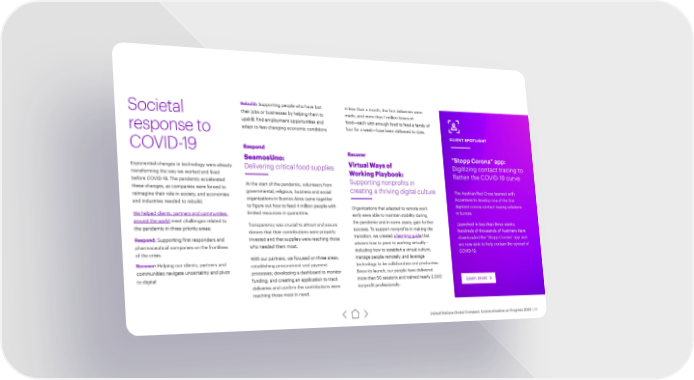 Rebuild: Supporting people who have lost In less than a month, the first deliveries were Societal their jobs or businesses by helping them to made, and more than 1 million boxes of upskill, find employment opportunities and food—each with enough food to feed a family of response to adapt to fast-changing economic conditions four for a week—have been delivered to date. CLIENT SPOTLIGHT COVID-19 Respond Recover SeamosUno: “Stopp Corona” app: Exponential changes in technology were already Delivering critical food supplies Virtual Ways of Digitizing contact tracing to transforming the way we worked and lived Working Playbook: flatten the COVID-19 curve before COVID-19. The pandemic accelerated At the start of the pandemic, volunteers from Supporting nonprofits in these changes, as companies were forced to governmental, religious, business and social creating a thriving digital culture The Austrian Red Cross teamed with reimagine their role in society, and economies develop one of the first and industries needed to rebuild. organizations in Buenos Aires came together Accenture to to figure out how to feed 4 million people with Organizations that adapted to remote work digitized corona contact tracing solutions . We helped clients, partners and communities limited resources in quarantine. early were able to maintain stability during in Europe around the world meet challenges related to Transparency was crucial to attract and assure the pandemic and in some cases, gain further Launched in less than three weeks, the pandemic in three priority areas: donors that their contributions were properly success. To support nonprofits in making the hundreds of thousands of Austrians have Respond: Supporting first responders and invested and that supplies were reaching those transition, we created a learning guide that downloaded the “Stopp Corona” app and pharmaceutical companies on the frontlines who needed them most. advises how to pivot to working virtually— are now able to help contain the spread of of the crisis including how to establish a virtual culture, COVID-19. With our partners, we focused on three areas: manage people remotely, and leverage Recover: Helping our clients, partners and establishing procurement and payment technology to be collaborative and productive. communities navigate uncertainty and pivot processes; developing a dashboard to monitor Since its launch, our people have delivered to digital funding; and creating an application to track more than 50 sessions and trained nearly 2,000 Learn more deliveries and confirm the contributions were nonprofit professionals. reaching those most in need. United Nations Global Compact: Communication on Progress 2020 | 24