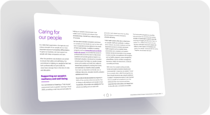helping our people to become even more personal or work-related issues that may affect The Accenture #moretogethernow site offers Caring for resilient and to maintain and enhance their job performance or mental, emotional or tools and support for everything from working physical energy, mental focus, value and sense physical well-being. remotely to mental health to specific topics like of purpose. parenting and juggling the demands of new “co- our people Public health systems often play a critical role in workers” (i.e., children). Since launch, the site We have demonstrated compassion and shown our people’s healthcare worldwide. In addition, has been continually refined and updated with our people just how deeply we care for them with where relevant, we provide employees and their relevant content based on the feedback and As a talent-led organization, the ingenuity and new or expanded services tailored to the needs dependents access to company-sponsored needs of our people—reinforced with the mantra, unique strengths of our people are our most of their local markets. In addition to existing health programs such as medical checks, “Together, we are better than ever.” important source of competitive differentiation. programs such as Thriving Mind and our Mental preventative care, outpatient and inpatient To grow our business, we must support our Health Ally network, we provided live access to medical, dental and prescription drug coverage. people with deep compassion and care. professionals around the clock to help answer In some countries, we supplement with programs questions and provide guidance based on an such as healthy pregnancy, stress management, After the pandemic was declared, we worked individual’s situation; introduced an innovative critical illness, chronic condition management, to ensure their safety and well-being. Our virtual program that helps our people manage biometrics, health risk assessments, nutritional commitment to helping our people be their best stress and anxieties and build their resilience; counseling and fitness. both professionally and personally has shared best practices for working from home; never been stronger than in this time of crisis and extended our benefits where possible, With most of our people working remotely, and disruption. from back-up dependent and family care, to human and social connections became even childcare discounts, education benefits, adoption more essential. In response, we created a “home” assistance and more. for our people online, called #moretogethernow. Supporting our people’s Even though Accenture was uniquely positioned resiliency and well-being We provide employee assistance programs in to adapt in virtual environments, it was important 100% of the countries where we operate, free that our people had somewhere to turn that of charge to all employees and people in their addressed their new concerns and fears, Our commitment to fostering a “Truly Human” households. All providers are available 24/7 for supported their entire selves, and helped them environment took on greater meaning in fiscal phone counseling and can assist with to stay safe, seen, connected and enabled. 2020, providing a road map and principles for United Nations Global Compact: Communication on Progress 2020 | 12