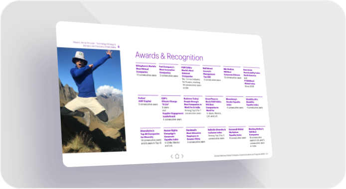Mayank, Senior Principal – Technology Strategy & Advisory, San Francisco, United States Awards & Recognition Ethisphere’s World’s Fast Company’s FORTUNE’s Wall Street 3BL Media’s Dow Jones Most Ethical Most Innovative World’s Most Journal’s 100 Best Sustainability Index Companies Companies Admired Management Corporate Citizens North America 14 consecutive years 2 consecutive years Companies Top 250 12 consecutive years and No. 1 in our industry 4 consecutive years FTSE4Good for 8 years, marking Global Index 19 consecutive years Since 2005 on list Forbes’ CDP’s Business Today/ Great Place to Bloomberg’s Disability:IN’s JUST Capital Climate Change People Strong’s Work/FORTUNE’s Gender Equality Disability 5 consecutive years “A List” Best Companies to 100 Best Index Equality Index 6 years Work For in India Companies to 4 consecutive years 4 consecutive years and Among Top 5 for 7 Work For Supplier Engagement consecutive years In Japan, Mexico, Leaderboard U.K. and U.S. 4 consecutive years DiversityInc’s Human Rights Randstad’s Refinitiv Diversity & Stonewall Global Working Mother’s Top 50 Companies Campaign’s Most Attractive Inclusion Index Workplace 100 Best for Diversity Corporate Employers in Among Top 3 for 3 Equality Index Companies 14 consecutive years Equality Index Greater China consecutive years 6 consecutive years 18 consecutive and 9 years in Top 15 In Chile, Mexico 3 consecutive years years in U.S. and 5 and U.S. consecutive years in India United Nations Global Compact: Communication on Progress 2020 | 69