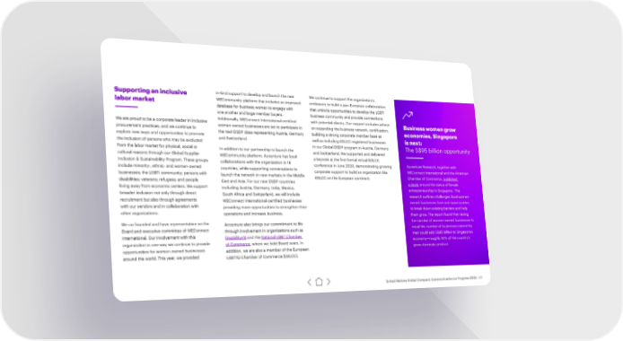 Supporting an inclusive in-kind support to develop and launch the new We continue to support the organization’s labor market WECommunity platform that includes an improved endeavors to build a pan-European collaboration database for business women to engage with that unlocks opportunities to develop the LGBTI one another and large member buyers. business community and provide connections We are proud to be a corporate leader in inclusive Additionally, WEConnect International-certified with potential clients. Our support includes advice Business women grow procurement practices, and we continue to women-owned businesses are set to participate in on expanding the business network, certification, economies, Singapore explore new ways and opportunities to promote the next DSDP class representing Austria, Germany building a strong corporate member base as the inclusion of persons who may be excluded and Switzerland. well as including EGLCC-registered businesses is next: from the labor market for physical, social or In addition to our partnership to launch the in our Global DSDP program in Austria, Germany The S$95 billion opportunity cultural reasons through our Global Supplier WECommunity platform, Accenture has local and Switzerland. We supported and delivered Inclusion & Sustainability Program. These groups collaborations with the organization in 16 a keynote at the first formal virtual EGLCC include minority-, ethnic- and women-owned conference in June 2020, demonstrating growing Accenture Research, together with countries, while supporting conversations to corporate support to build an organization like WEConnect International and the American businesses; the LGBTI community; persons with launch the network in new markets in the Middle EGLCC on the European continent. Chamber of Commerce, published disabilities; veterans; refugees; and people East and Asia. For our new DSDP countries a study around the status of female living away from economic centers. We support including Austria, Germany, India, Mexico, entrepreneurship in Singapore. The broader inclusion not only through direct South Africa and Switzerland, we will include research outlines challenges local women- recruitment but also through agreements WEConnect International-certified businesses owned businesses face and opportunities with our vendors and in collaboration with providing more opportunities to strengthen their to break down existing barriers and help other organizations. operations and increase business. them grow. The report found that raising We co-founded and have representation on the Accenture also brings our commitment to life the number of women-owned businesses to Board and executive committee of WEConnect through involvement in organizations such as equal the number of businesses owned by International. Our involvement with this Disability:IN and the National LGBT Chamber men could add S$95 billion to Singapore’s organization is one way we continue to provide of Commerce, where we hold Board seats. In economy—roughly 20% of the country’s opportunities for women-owned businesses addition, we are also a member of the European gross domestic product. around the world. This year, we provided LGBTIQ Chamber of Commerce (EGLCC). United Nations Global Compact: Communication on Progress 2020 | 49