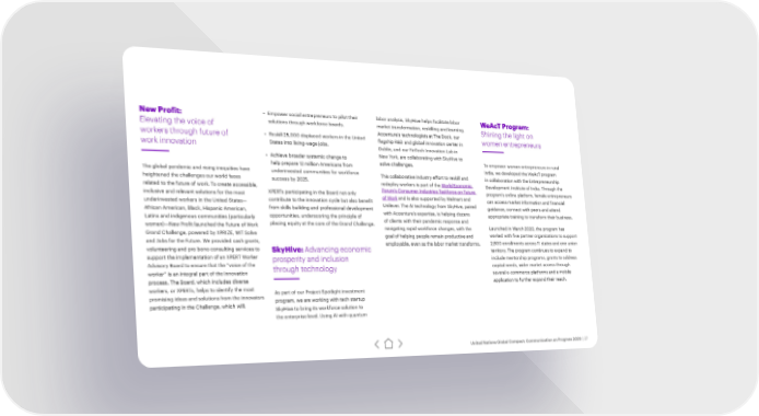New Profit: • Empower social entrepreneurs to pilot their labor analysis, SkyHive helps facilitate labor WeAcT Program: Elevating the voice of solutions through workforce boards. market transformation, reskilling and learning. Shining the light on workers through future of • Reskill 25,000 displaced workers in the United Accenture’s technologists at The Dock, our women entrepreneurs States into living-wage jobs. flagship R&D and global innovation center in work innovation Dublin, and our FinTech Innovation Lab in • Achieve broader systemic change to New York, are collaborating with SkyHive to help prepare 12 million Americans from solve challenges. To empower women entrepreneurs in rural The global pandemic and rising inequities have underinvested communities for workforce India, we developed the WeAcT program heightened the challenges our world faces success by 2025. This collaborative industry effort to reskill and in collaboration with the Entrepreneurship World Economic related to the future of work. To create accessible, redeploy workers is part of the Development Institute of India. Through the XPERTs participating in the Board not only Forum’s Consumer Industries Taskforce on Future program’s online platform, female entrepreneurs inclusive and relevant solutions for the most and is also supported by Walmart and contribute to the innovation cycle but also benefit of Work can access market information and financial underinvested workers in the United States— Unilever. The AI technology from SkyHive, paired African American, Black, Hispanic American, from skills building and professional development guidance, connect with peers and attend opportunities, underscoring the principle of with Accenture’s expertise, is helping dozens appropriate training to transform their business. Latinx and indigenous communities (particularly of clients with their pandemic response and women)—New Profit launched the Future of Work placing equity at the core of the Grand Challenge. navigating rapid workforce changes, with the Launched in March 2020, the program has Grand Challenge, powered by XPRIZE, MIT Solve goal of helping people remain productive and worked with five partner organizations to support and Jobs for the Future. We provided cash grants, employable, even as the labor market transforms. 2,800 enrollments across 11 states and one union volunteering and pro bono consulting services to SkyHive: Advancing economic territory. The program continues to expand to support the implementation of an XPERT Worker prosperity and inclusion include mentorship programs, grants to address Advisory Board to ensure that the “voice of the through technology capital needs, wider market access through worker” is an integral part of the innovation several e-commerce platforms and a mobile process. The Board, which includes diverse application to further expand their reach. workers, or XPERTs, helps to identify the most As part of our Project Spotlight investment promising ideas and solutions from the innovators program, we are working with tech startup participating in the Challenge, which will: SkyHive to bring its workforce solution to the enterprise level. Using AI with quantum United Nations Global Compact: Communication on Progress 2020 | 27