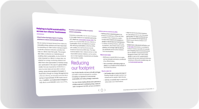 Helping to build sustainability Accenture and Salesforce help companies Achieve net-zero emissions by 2025 In alignment with the Paris Climate Agreement, across our clients’ businesses embed sustainability • We’ll focus first on actual reductions in our we’ve also pledged to do our part to keep global emissions by powering our offices with 100% warming below 1.5° Celsius by joining the more Integrating sustainability into the core of business renewable energy, engaging key suppliers than 400 companies that have signed the UN Client Carbon Savings program: Creating is now easier thanks to our expanded partnership to reduce their emissions and equipping our Global Compact’s Business Ambition for 1.5° solutions to reduce environmental impact with Salesforce. Announced in January 2021, the people to make climate-smart travel decisions. Pledge to date. power of our Sustainability Services, Salesforce • To address remaining emissions, we’ll invest We are seeing increased demand from clients for Sustainability Cloud, and Salesforce Customer Multiple industry-wide external certifications, such in proprietary, nature-based carbon removal ISO® 14001, demonstrate our commitment to renewable energy solutions and have responded 360 will bring sustainability to the front office as with visibility into real-time Environmental, solutions, such as large-scale tree planting, running our business responsibly and sustainably by expanding our Client Carbon Savings program that will directly remove carbon emissions and to integrating robust environmental practices to identify emissions-reduction activities that Social and Governance (ESG) data. This helps from the atmosphere. help our clients meet their goals. This program business leaders track, measure and act on their into our operations. Accenture’s Environment also helps us advance our material issue of responsible business initiatives, such as carbon Move to zero waste Management System is ISO® 14001-certified enabling client sustainability. As the COVID-19 use, to meet regulatory requirements and develop • We’ll reuse or recycle 100% of our e-waste, globally—to see our ISO®-certified locations, crisis impacted our clients in unique ways, we new business models. such as computers and servers, as well as all locations that use smart metering and where we’re adapted our energy monitoring solutions and of our office furniture. powering our offices with renewable energy, visit Environmental Impact Map. idled them when appropriate to minimize energy our use—particularly in the case of a global athletic Reducing • We’re committed to eliminating single-use retailer that was impacted by COVID-19 on a plastics in our locations at the conclusion of store-by-store basis and was able to reduce our footprint the COVID-19 pandemic. energy use as store operations fluctuated. In Plan for water risk fiscal 2020, through our Energy Management-as- Over the last decade, we have continually set bigger a-Service offering, we identified potential client and bolder environmental goals for ourselves, • We’ll develop plans to reduce the impact of savings of approximately 15,750 metric tons of innovating our approach to environmental flooding, drought and water scarcity on our CO. In addition, we implemented strategies to sustainability and making strategic investments. business and our people in high-risk areas. 2 • We’ll also immediately begin to measure and help clients avoid 808,890 metric tons of CO . 2 Our new, industry-leading climate action goals take an reduce water use in these locations. ambitious approach to addressing energy, waste and water management. By 2025, we have committed to: United Nations Global Compact: Communication on Progress 2020 | 36