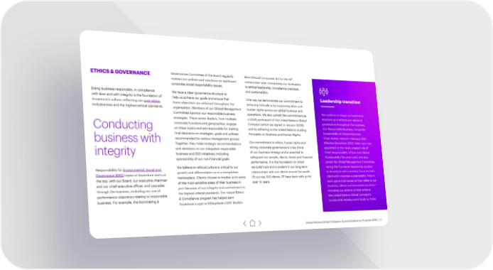 Governance Committee of the Board regularly th ETHICS & GOVERNANCE Most Ethical Companies list for the 14 reviews our policies and practices on significant consecutive year, recognizing our dedication corporate social responsibility issues. to ethical leadership, compliance practices Doing business responsibly, in compliance and sustainability. We have a clear governance structure to Leadership transition with laws and with integrity is the foundation of help us achieve our goals and ensure that One way we demonstrate our commitment to Accenture’s culture, reflecting our core values, these objectives are reflected throughout the behaving ethically is by supporting labor and inclusiveness and the highest ethical standards. organization. Members of our Global Management human rights across our global business and Committee sponsor our responsible business operations. We also uphold this commitment as We continue to shape our leadership strategies. These senior leaders, from multiple a LEAD participant of the United Nations Global structure so it reflects our values of corporate functions and geographies, engage Compact (which we signed in January 2008) governance throughout the business. Conducting on these topics and are responsible for making and by adhering to the United Nations Guiding Our Responsible Business, Corporate final decisions on strategies, goals and policies Principles on Business and Human Rights. Sustainability & Citizenship Lead, business with recommended by various management groups. Chad Jerdee, retired in February 2021. Together, they make strategic recommendations Our commitment to ethics, human rights and Effective December 2020, Peter Lacy was and decisions on our integrated responsible strong corporate governance is a key driver appointed to the newly created role of integrity business and ESG initiatives, including of our business strategy and is essential to Chief Responsibility Officer and Global sponsorship of our non-financial goals. safeguard our people, clients, brand and financial Sustainability Services Lead, and also performance. It is the foundation on which joined the Global Management Committee, Responsibility for Environmental, Social and We believe an ethical culture is critical to our we build trust and is evident in our long-term taking the first senior leadership position Governance (ESG) topics at Accenture starts at growth and differentiates us in a competitive relationships with our clients around the world. at Accenture with a primary focus on both the top, with our Board, our executive chairman marketplace. Clients choose to involve us in some Of our top 100 clients, 97 have been with us for client and corporate sustainability. Peter’s and our chief executive officer, and cascades of the most sensitive areas of their business in over 10 years. work spans ESG issues as they relate to our through the business, including our use of part because of our integrity and commitment to business, clients and ecosystem partners— performance objectives relating to responsible the highest ethical standards. Our robust Ethics including our actions to help achieve business. For example, the Nominating & & Compliance program has helped earn the United Nations Global Compact’s Accenture a spot on Ethisphere’s 2021 World’s Sustainable Development Goals by 2030. United Nations Global Compact: Communication on Progress 2020 | 52