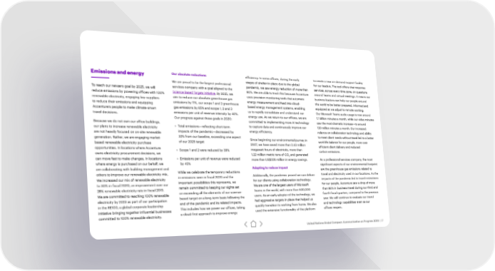 Emissions and energy Our absolute reductions efficiency. In some offices, during the early to create a new on-demand support facility We are proud to be the largest professional stages of shelter-in-place due to the global for our leaders. The tool offers chat response services company with a goal aligned to the pandemic, we saw energy reduction of more than services, across every time zone, on questions To reach our net-zero goal by 2025, we will 80%. We are able to track this because Accenture around Teams and virtual meetings. It means our reduce emissions by powering offices with 100% Science Based Targets initiative. By 2025, we uses precision monitoring tools that automate business leaders can help our people around renewable electricity, engaging key suppliers aim to reduce our absolute greenhouse gas energy measurement and feed into cloud- the world to be better prepared, informed and to reduce their emissions and equipping emissions by 11%, our scope 1 and 2 greenhouse based energy management systems, enabling equipped as we adjust to remote working. Accenture’s people to make climate-smart gas emissions by 65% and scope 1, 2 and 3 us to rapidly consolidate and understand our Our Microsoft Teams audio usage is now around travel decisions. emissions per unit of revenue intensity by 40%. energy use. As we return to our offices, we are 1.1 billion minutes a month, while our video minutes Our progress against those goals in 2020: committed to implementing more AI technology saw the most dramatic increase—to around Because we do not own our office buildings, to capture data and continuously improve our 120 million minutes a month. Our increased our plans to increase renewable electricity • Total emissions—reflecting short-term are not heavily focused on on-site renewable impacts of the pandemic—decreased by energy efficiency. reliance on collaboration technology and ability generation. Rather, we are engaging market- 32% from our baseline, exceeding one aspect to meet client needs without travel led to a better of our 2025 target Since beginning our environmental journey in work-life balance for our people, more cost- based renewable electricity purchase 2007, we have saved more than 2.43 million efficient client delivery and reduced opportunities. In locations where Accenture • Scope 1 and 2 were reduced by 39% megawatt hours of electricity, more than carbon emissions. owns electricity procurement decisions, we 1.22 million metric tons of CO and generated can move fast to make changes. In locations • Emissions per unit of revenue were reduced 2 more than US$326 million in energy savings. As a professional services company, the most where energy is purchased on our behalf, we by 45% significant aspects of our environmental footprint are collaborating with building management and Adapting to reduce impact are the greenhouse gas emissions related to others to improve our renewable electricity mix. While we celebrate the temporary reductions travel and electricity used in our locations. As the We increased our mix of renewable electricity in emissions seen in fiscal 2020 and the Additionally, the pandemic proved we can deliver important possibilities this represents, we for our clients using collaboration technology. impacts of the pandemic led to travel restrictions to 30% in fiscal 2020, an improvement over our remain committed to keeping our sights set We are one of the largest users of Microsoft for our people, Accenture saw a drop of more 26% renewable electricity rate in fiscal 2019. on exceeding all the elements of our science- Teams in the world, with more than 500,000 than 86% in business travel during our third and We are committed to reaching 100% renewable based target on a long-term basis following the users. As an early adopter of the technology, we fourth fiscal quarters, compared to the previous electricity by 2023 as part of our participation end of the pandemic and its related impacts. had aggressive targets in place that helped us year. We will continue to evaluate our travel in the RE100, a global corporate leadership This includes how we power our offices, taking quickly transition to working from home. We also and technology capabilities even as our initiative bringing together influential businesses a cloud-first approach to improve energy used the extensive functionality of the platform offices reopen. committed to 100% renewable electricity. United Nations Global Compact: Communication on Progress 2020 | 37