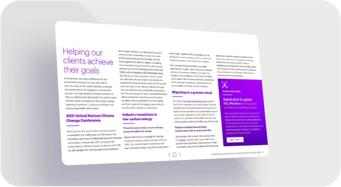 technologies will play in accelerating the pace of smart meter. Together with IoT company O2, we treatments to fuel the company’s transition to the Helping our environmental sustainability to meet the needs developed a communications hub to connect U.K. cloud. Over three years, the integrated Accenture/ of the environment and communities. We will energy consumers, smart meters and suppliers. AWS/Takeda team will move 80% of Takeda clients achieve bring together key clients to deliver compelling From concept through execution, we shared applications to the cloud and close nine data centers, and actionable thought leadership with strategic expertise from supply chain to security processes, with the goal of increasing efficiencies to accelerate partners such as the World Economic Forum and testing and employee upskilling. The rollout has drug development and innovation while reducing their goals UNGC, and co-develop a CEO Biodiversity study. resulted in the installation of more than 5.5 million costs and environmental impacts. We will use our deep expertise to focus on how smart meters, with Accenture services contributing At Accenture, we make a difference for the we collectively drive innovation and solutions to to the improved streamlining, measurement and environment through our work with clients, reshape the future of industry. Beyond COP we will accountability of energy use and emissions. who are some of the world’s leading companies work with each of our clients to identify the ways and governments. By engaging our ecosystem they can become more sustainable organizations Migrating to a greener cloud CLIENT SPOTLIGHT partners, we help develop innovative solutions to and find new sources of value. Sustainable thinking help our clients reach their goals. Our priority areas will be infused into everything we do because Digital plant for global include industry transitions to low-carbon energy; we believe that sustainability is the new digital Our recent The Green Behind the Cloud research CO filtration: Driving scale migrating to greener IT, cloud and software; and and that it presents the biggest opportunity for found that companies can unlock greater financial, 2 driving responsible value chains. transformative change for a generation. societal and environmental benefits through cloud- to meet an ambitious vision Industry transitions to based circular operations and sustainable products Addressing global warming is a top priority for 2021 United Nations Climate and services. Migrations to the public cloud can many. That’s why Swiss eco-tech Climeworks reduce CO emissions by 59 million tons per year, Change Conference low-carbon energy 2 teamed with Accenture to create a digital plant which equates to taking 22 million cars off the road. to help optimize performance and increase O2 and Accenture deliver smart metering Takeda accelerates data and digital competitiveness. This will help Climeworks reach We know that the next frontiers of environmental across 20 million U.K. homes transformation with Accenture and AWS its ambitious goal of filtering 1% of global CO sustainability are challenging and will require new 2 Aligned with the EU’s mandate for member emissions from the air by 2025. innovations and ways of collaborating across industries We partnered with Amazon Web Services (AWS) th countries to reduce carbon emissions 20% by and borders. In November 2021, during the 26 Takeda, a global, values-based, R&D-driven and Learn more United Nations Climate Change Conference (COP 26) 2020, the United Kingdom determined that biopharmaceutical leader headquartered in Japan, we will highlight the role emerging and established every domestic energy customer should have a committed to discover and deliver life-transforming United Nations Global Compact: Communication on Progress 2020 | 35