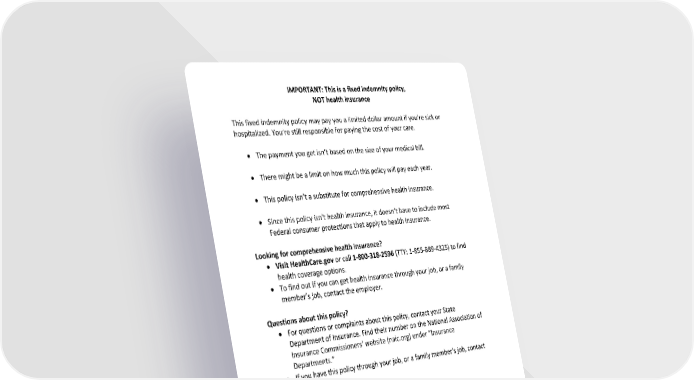 IMPORTANT: This is a fixed indemnity policy, NOT health insurance This fixed indemnity policy may pay you a limited dollar amount if you’re sick or hospitalized. You’re still responsible for paying the cost of your care. • The payment you get isn’t based on the size of your medical bill. • There might be a limit on how much this policy will pay each year. • This policy isn’t a substitute for comprehensive health insurance. • Since this policy isn’t health insurance, it doesn’t have to include most Federal consumer protections that apply to health insurance. Looking for comprehensive health insurance? • Visit HealthCare.gov or call 1-800-318-2596 (TTY: 1-855-889-4325) to find health coverage options. • To find out if you can get health insurance through your job, or a family member’s job, contact the employer. Questions about this policy? • For questions or complaints about this policy, contact your State Department of Insurance. Find their number on the National Association of Insurance Commissioners’ website (naic.org) under “Insurance Departments.” • If you have this policy through your job, or a family member’s job, contact the employer.