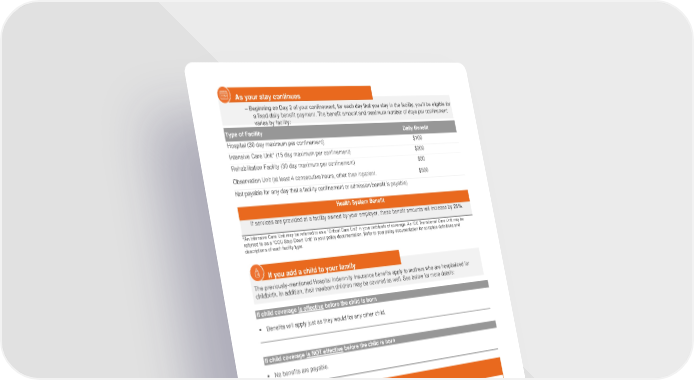 As your stay continues ‒ Beginning on Day 2 of your confinement, for each day that you stay in the facility, you’ll be eligible for a fixed daily benefit payment. The benefit amount and maximum number of days per confinement varies by facility: Type of Facility Daily Benefit Hospital (30 day maximum per confinement) $100 Intensive Care Unit* (15 day maximum per confinement) $200 Rehabilitation Facility (30 day maximum per confinement) $50 Observation Unit (at least 4 consecutive hours, other than inpatient. $500 Not payable for any day that a facility confinement or admission benefit is payable) Health System Benefit If services are provided at a facility owned by your employer, these benefit amounts will increase by 25%. *An Intensive Care Unit may be referred to as a “Critical Care Unit” in your certificate of coverage. An ICU Transitional Care Unit may be referred to as a “CCU Step-Down Unit” in your policy documentation. Refer to your policy documentation for complete definitions and descriptions of each facility type. If you add a child to your family The previously-mentioned Hospital Indemnity Insurance benefits apply to mothers who are hospitalized for childbirth. In addition, their newborn children may be covered as well. See below for more details: If child coverage is effective before the child is born ▪ Benefits will apply just as they would for any other child. If child coverage is NOT effective before the child is born ▪ No benefits are payable. Enrollment instructions will be provided by your employer. If you have additional questions before you enroll, please call: Voya Employee Benefits Customer Service at (877) 236-7564 or go to https://presents.voya.com/EBRC/UnityPointHealth Ready to Enroll?