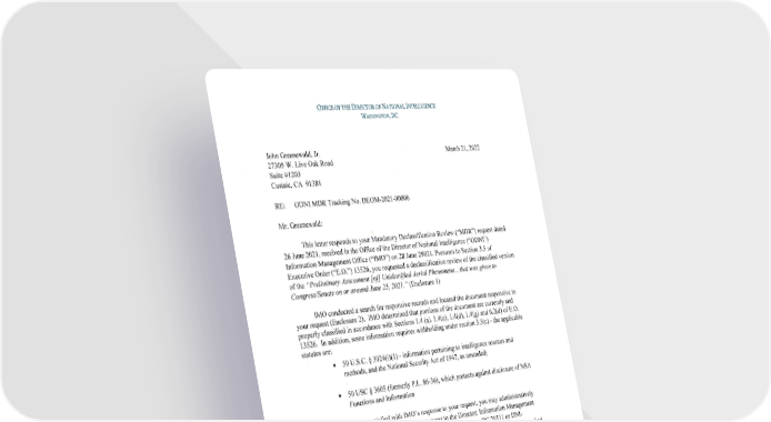 OFFICE OF THE DIRECTOR OF NATIONAL INTELLIGENCE WASHINGTON, DC John Greenewald, Jr. 27305 W . L ive Oak Road Suite #1203 Castaic, CA 91384 RE : ODNI MDR Tracking No. DEOM -2021-00006 Mr. Greenewald : March 21 , 2022 This letter responds to your Mandatory Declassification Review (" MDR " ) request dated 26 June 2021 , received in the Office of the Director of National Intelligence (" ODNI " ) Information Manageme nt Office (" IMO ") on 28 June 29021. Pursuant to Section 3 .5 of Executive Order (" E.O . ") 13526 , you requested a declassification review of the classified version of the "Preliminar y Assessment [oj] Unidentified Aerial Phenom ena ... that was giv en to Congress /Senate on or around June 25 , 2021. " (Enclosure 1) IMO conducted a search for responsive records and located the document responsive to your request (Enclosure 2) . IMO determined that portions of the document are currently and properly classified in accordance with Sections IA (a) . lA(c) , lA(d) , 1.4(g) and 6 .2(d) of E .O. 13526. In addition , some information requires withholding under section 3 .5(c) - the applicable statutes are: • 50 U.S . c. § 3024(i)(1) - information pertaining to intelligence sources and methods , and the National Security Act of 1947 , as amended; • 50 USC § 3605 (formerly P.L. 86-36), which protects against disclosure ofNSA Functions and Information If you are not satisfied with IMO ' s response to your request , you may administratively appeal this decision by submitting a written request to the Director , Information Management Office , Office of the Director of National Intelligence , Washington , DC 20511 or DNI - FOIA @ dni .gov . The request letter and envelope , or subject line of the email , should be marked " MDR Appeal. " The appeal must specify the document(s) or information to be considered on appeal. Your appeal must be postmarked or electronically transmitted within 60 days of the date of this letter.