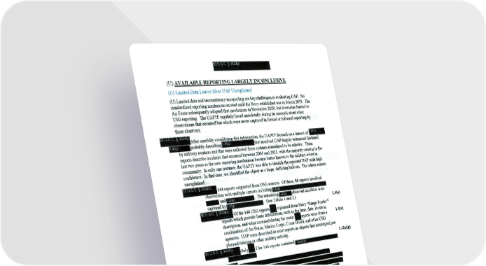 50 USc § 3024(1) (U) AVAILABLE REPORTING LARGELY INCONCLUSIVE (U) Limited Data Leaves Most UAP Unexplained (U) Limited data and inconsistency in rep0l1ing are key challenges to evaluating UAP. No standardized rep0l1ing mechanism existed until the Navy established one in March 2019 . The Air Force subsequently adopted that mechanism in November 2020 , but it remains limited to USG rep0l1ing . The UAPTF regularly heard anecdotally dming its research about other observations that occUlTed but which were never captured in fOlmal or infOlmal rep0l 1ing by those observers. carefully con~ion , the UAPTF focused on a dataset of _ Df()l)al)lv des c ribing ~ that involved UAP largely witnessed ftrsthand aviators and that were collected from systems considered to be reliable . These rep0l1s describe incidents that OCCUlTed between 2004 and 2021 , with the majority coming in the last two years as the new rep0l1ing mechanism became better known to the military aviation commtnllty. In only one instance , the UAPTF was able to identify the reported UAP with high confidence . . In that case , we identified the object as a large , deflating balloon. The others remain lmexplained. 144 repol1s originated from USG somces. Of these, 80 rep0l1s invo lved n h.,,,,, • .,, ""tt · with multiple sensors including 14(a) ••• and . The remaining IIIEJ observed incidents were (See Tables 1 and 2.) 1.4(a) Of the 144 USG repol1s_ riginated from Navy "Range Fouler,,2 which provide basic infOlmation , such as the time , date , location , description , and what occmred dming the event. _eports were from a 1.4( a) combination of Air Force , Marine Corps , Coast Guard , and other USG agenCIes. UAP were described in most rep0l1s as objects that intenupted pre- planned or other militaIY activity . l.4(a)(g) 50 USc § 3024(1) f the 144 rep011s contained 1 A(a)(g) 50 USC § 3024(1) 1 4(c) Although these rep0l1s 14(c) the descriptions of lmknown targets 1 4(c) ===============- •••• as in a limited lllUllber of instances. 1.4 c 2 (U) U.S . Navy aviators defme a "range fouler" as an activity or object that interrupts pre-phullled training or other in a military operating area or restricted air space. - 4 50 USC § 3024(1)