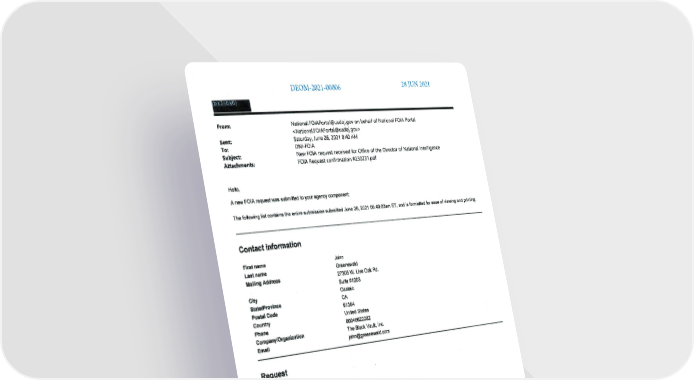 DEOM-2021 -00006 28 JUN 2021 (b )( 3 )( b )( 6 ) From: NationaI.FO I APortal@usdoj.gov on behalf of Nat ional FOIA Portal < NationaI.FOIAPortal@usdoj.gov> Sent: To: Subject: Attachments: Hello, Saturday. June 26. 2021 8:40 AM DNI-FO IA New FOIA request received for Office of the Director of National Intelligence FOIA Request confirmation #230231.pdf A new FOIA request was submitted to your agency component: The following list contains the entire submission submitted June 26,2021 08 :40:02am ET, and is fornlatted for ease of viewing and printing. Contact information First name Last name Mailing Address John Greenewald 27305 W. Live Oak Rd. Suite #1203 City Castaic State/Province CA Postal Code 91384 Country Phone Company/Organization Email United States 80045622282 The Black Vault, Inc. john@greenewald.com Request Request 10 230756 Confirmation 230231 10 Request description To whom it may concern, This is a request for a mandatory declassification review (MDR) , under the terms of Executive Order 13526, of the following document(s): Preliminary Assessment: Unidentified Aerial Phenomena (Or other title). I am seeking the CLASSIFIED version of this report : https:/Iwww .dni.govlindex.php/newsroom/reports-publications/reports- publications-2021Iiteml2223 -preliminary-assessment-un identified-aeria l- phenomena .. that was given to Congress/Senate on June 25 , 2021. To be clear, I am NOT asking for the public version of the report. I am seeking the classified "annex' or report or any other material that was given to Congress/Senate on (or around) June 25, 2021 . It is my believe that despite the classified nature of the material, it should not be exempted 100%. I ask that the information be reviewed, and the non-exempted information released . Thank you for your time, and I look forward to your response! Sincerely , John Greenewald , Jr . 27305 W. Live Oak Rd . Suite #1203 Castaic, Ca. 91384 FAX 1-818-659-7688 1