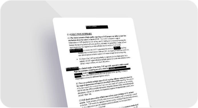 50 U.S.C. § 3024(i) (U) EXECUTIVE SUMMARY (U) The limited amount of high-quality reporting on UAP hampers our ability to draw firm conclusions about the nature or intent of UAP. The UAPTP considered a range of information on UAP described in U.S. military and IC (Intelligence Community) reporting, but because the reporting lacked sufficient specificity, ultimately recognized that a unique, tailored reporting process was required to provide sufficient data for analysis ofUAP events. 50 U.S.C. § 3024(i) As a result, the UAPTP concentrated its review on ~escribing InCIdents that occurred between 2004 and 2021, the majority of which are a result of a new tailored process to better capture UAP events through formalized reporting. 50 U.S.C. § 3024(i) • (U) Most of the UAP reported probably do represent physical objects given that a majority of UAP registered across multiple sensors, to include radar, infrared, electro- optical, weapon seekers, and visual observation. In a limited number of incidents, UAP reportedly appeared to exhibit unusual flight characteristics, including several in which the 1.4(a)( e )(g) ~1.4(a)(e)(g) ,==" involvin • These observations could be the result of sensor errors, spoofing, or observer . misperception and require additional rigorous analysis. (U) There are probably multiple types ofUAP requiring different explanations based on the range of appearances and behaviors described in the available reporting. Our analysis of the data supports the construct that if and when individual UAP incidents are resolved they will fall into one offive potential explanatory categories: airborne clutter, natural atmospheric phenomena, USG or U.S. industry developmental programs, foreign adversary systems, and a catchall "other" bin. (U) UAP clearly pose a safety of flight issue and may pose a challenge to U.S. national security. Safety concerns primarily center on aviators contending with an increasingly cluttered air domain. UAP would also represent a national security challenge if they are foreign adversary collection platforms or provide evidence a potential adversary has developed either a breakthrough or disruptive technology. (U) Consistent consolidation of reports from across the federal government, standardized reporting, increased collection and analysis, and a streamlined process for screening all such reports against a broad range of relevant USG data will allow for a more sophisticated analysis ofUAP that is likely to deepen our understanding. Some of these steps are resource-intensive and would require additional investment. 3 50 U.S.C. § 3024(i)