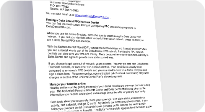 Questions Regarding Your Plan If you have questions regarding your dental benefits plan, you may call: Delta Dental of Washington Customer Service 1-800-537-3406 Written inquiries may be sent to: Delta Dental of Washington Customer Service Department P.O. Box 75983 Seattle, WA 98175-0983 You can also email us at [email protected] . Finding a Delta Dental PPO Network Dentist You can find the most current listing of participating PPO dentists by going online to DeltaDentalWA.com. When you use the online directory, please be sure to search using the Delta Dental PPO network. If you call your dentist’s office to check if they are in network, please tell them you are a Delta Dental PPO plan member. With the Uniform Dental Plan (UDP), you get the best coverage and financial protection when you see a dentist who is part of the Delta Dental PPO network. Participating PPO network dentists can also save you time and money. That’s because they submit claim forms directly to Delta Dental and agree to provide care at discounted fees. If you choose to get care out-of-network, you’re covered. You may get care from Delta Dental Premier® dentists, or from other non-network dentists. Plan benefits are usually lower compared to in-network PPO dentists and you may need to have your dentist complete and sign a claim form. Please remember, non-contracted, out-of-network dentists may bill you for charges in excess of the Uniform Dental Plan’s allowed payments. Manage your benefits online Healthy smiles start by getting the most of your dental benefits and we’ve got the tools to help you. The MySmile® Personal Benefits Center and Delta Dental Mobile App give you the information you need to understand and manage dental benefits for you and your family. Both tools allow you to securely check your coverage, view claim status, monitor dental activity, find a dentist, and get ID cards. MySmile is our most comprehensive tool. It also helps you compare dental costs and choose personal profile features like earth-friendly, paperless Explanations of Benefits. The Delta Dental mobile app puts key information at your fingertips when you’re on the go. Your online account allows you to access MySmile with a single username and password. Register for MySmile at DeltaDentalWA.com. 2024-01-03000-BB i LG PPOL 20240101