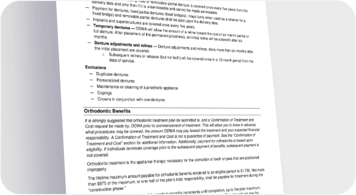 — Fixed partial dentures (fixed bridges) — Removable partial dentures — Inlays when used as a retainer for a fixed partial denture (fixed bridge) — Adjustment or repair of an existing prosthetic appliance — Surgical placement or removal of implants or attachments to implants Limitations — Replacement of an existing fixed or removable partial denture is covered once every five years from the delivery date and only then if it is unserviceable and cannot be made serviceable. — Payment for dentures, fixed partial dentures (fixed bridges); inlays (only when used as a retainer for a fixed bridge) and removable partial dentures shall be paid upon the delivery date. — Implants and superstructures are covered once every five years. — Temporary dentures — DDWA will allow the amount of a reline toward the cost of an interim partial or full denture. After placement of the permanent prosthesis, an initial reline will be a benefit after six months. — Denture adjustments and relines — Denture adjustments and relines, done more than six months after the initial placement are covered. o Subsequent relines or rebases (but not both) will be covered once in a 12-month period from the date of service. Exclusions — Duplicate dentures — Personalized dentures — Maintenance or cleaning of a prosthetic appliance — Copings — Crowns in conjunction with overdentures Orthodontic Benefits It is strongly suggested that orthodontic treatment plan be submitted to, and a Confirmation of Treatment and Cost request be made by, DDWA prior to commencement of treatment. This will allow you to know in advance what procedures may be covered, the amount DDWA may pay toward the treatment and your expected financial responsibility. A Confirmation of Treatment and Cost is not a guarantee of payment. See the “Confirmation of Treatment and Cost” section for additional information. Additionally, payment for orthodontia is based upon eligibility. If individuals terminate coverage prior to the subsequent payment of benefits, subsequent payment is not covered. Orthodontic treatment is the appliance therapy necessary for the correction of teeth or jaws that are positioned improperly. The lifetime maximum amount payable for orthodontic benefits rendered to an eligible person is $1,750. Not more than $875 of the maximum, or one-half of the plan's total responsibility, shall be payable for treatment during the “construction phase.” The remaining plan payments shall be made in monthly increments until completion, up to the plan maximum, providing the employee is eligible and the dependent meets eligibility requirements. The plan will not pay for treatment if claim forms are submitted more than 12 months after banding date. The amount payable for orthodontic treatment shall be 50 percent of the lesser of the maximum allowable fees or the fees actually charged. Covered Dental Benefits — Fixed or removable appliance therapy for the treatment of teeth or jaws. 2024-01-03000-BB 16 LG PPOL 20240101