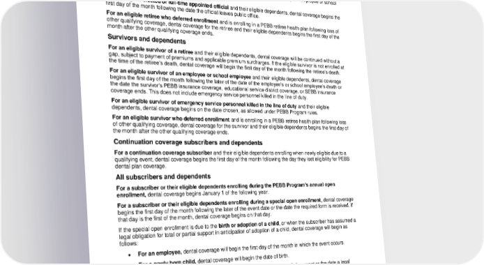 Retirees and dependents For an eligible retiring employee or retiring school employee and their eligible dependents, dental coverage begins on the first day of the month after the employer-paid coverage, COBRA coverage, or continuation coverage ends. For an eligible employee or school employee determined to be retroactively eligible for disability retirement and their eligible dependents, dental coverage begins on the date chosen by the employee or school employee as allowed under PEBB Program rules. For an eligible elected or full-time appointed official and their eligible dependents, dental coverage begins the first day of the month following the date the official leaves public office. For an eligible retiree who deferred enrollment and is enrolling in a PEBB retiree health plan following loss of other qualifying coverage, dental coverage for the retiree and their eligible dependents begins the first day of the month after the other qualifying coverage ends. Survivors and dependents For an eligible survivor of a retiree and their eligible dependents, dental coverage will be continued without a gap, subject to payment of premiums and applicable premium surcharges. If the eligible survivor is not enrolled at the time of the retiree’s death, dental coverage will begin the first day of the month following the retiree’s death. For an eligible survivor of an employee or school employee and their eligible dependents, dental coverage begins the first day of the month following the later of the date of the employee’s or school employee’s death or the date the survivor’s PEBB insurance coverage, educational service district coverage, or SEBB insurance coverage ends. This does not include emergency service personnel killed in the line of duty. For an eligible survivor of emergency service personnel killed in the line of duty and their eligible dependents, dental coverage begins on the date chosen, as allowed under PEBB Program rules. For an eligible survivor who deferred enrollment and is enrolling in a PEBB retiree health plan following loss of other qualifying coverage, dental coverage for the survivor and their eligible dependents begins the first day of the month after the other qualifying coverage ends. Continuation coverage subscribers and dependents For a continuation coverage subscriber and their eligible dependents enrolling when newly eligible due to a qualifying event, dental coverage begins the first day of the month following the day they lost eligibility for PEBB dental plan coverage. All subscribers and dependents For a subscriber or their eligible dependents enrolling during the PEBB Program’s annual open enrollment, dental coverage begins January 1 of the following year. For a subscriber or their eligible dependents enrolling during a special open enrollment, dental coverage begins the first day of the month following the later of the event date or the date the required form is received. If that day is the first of the month, dental coverage begins on that day. If the special open enrollment is due to the birth or adoption of a child, or when the subscriber has assumed a legal obligation for total or partial support in anticipation of adoption of a child, dental coverage will begin as follows: • For an employee, dental coverage will begin the first day of the month in which the event occurs. • For a newly born child, dental coverage will begin the date of birth. • For a newly adopted child, dental coverage will begin on the date of placement or the date a legal obligation is assumed in anticipation of adoption, whichever is earlier. • For a spouse or state-registered domestic partner of a subscriber, dental coverage will begin the first day of the month in which the event occurs. If the special open enrollment is due to the enrollment of an extended dependent or a dependent child with a disability, dental coverage will begin the first day of the month following the event date or eligibility certification, whichever is later. 2024-01-03000-BB 23 LG PPOL 20240101