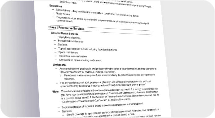 — A Comprehensive Series or a panoramic X-ray is covered once in a five-year period from the date of service. o Any number or combination of X-rays, with the exception of a Panoramic X-ray, billed for the same date of service, where the combined fees are equal to or exceed the allowed fee for a Comprehensive Series, will be considered a Comprehensive Series for payment and benefit limitation purposes. — A set of Bitewing X-rays (two or more images) are covered once in a benefit period. o A single Bitewing X-ray is covered, there are no Limitations on the number of single Bitewing X-rays a patient can have. Exclusions — Consultations – diagnostic service provided by a dentist other than the requesting dentist — Study models — Diagnostic services and X-rays related to temporomandibular joints (jaw joints) are not a Class I paid covered benefit. Class I Preventive Services Covered Dental Benefits — Prophylaxis (cleaning) — Periodontal maintenance — Sealants — Topical application of fluoride including fluoridated varnishes — Space maintainers — Preventive resin restoration — Application of caries arresting medicament Limitations — Any combination of prophylaxis and periodontal maintenance is covered twice in a calendar year (refer to Class II Periodontics for additional limitation information). o Periodontal maintenance procedures are covered only if a patient has completed active periodontal treatment. — For any combination of adult prophylaxis (cleaning) and periodontal maintenance, third and fourth occurrences may be covered if your gums have Pocket depth readings of 5mm or greater.* *Note: These benefits are available only under certain conditions of oral health. It is strongly recommended that you have your dentist submit a Confirmation of Treatment and Cost request to determine if the treatment is a covered dental benefit. A Confirmation of Treatment and Cost is not a guarantee of payment. See the “Confirmation of Treatment and Cost” section for additional information. — Topical application of fluoride is limited to two covered procedures in a benefit period. — Sealants: o Benefit coverage for application of sealants is limited to permanent molars that have no restorations (includes preventive resin restorations) on the occlusal (biting) surface. o The application of a sealant is a covered dental benefit once in a three-year period per tooth from the date of service. — Space maintainers are covered once in a patient’s lifetime for the same missing tooth or teeth through age 17. 2024-01-03000-BB 10 LG PPOL 20240101