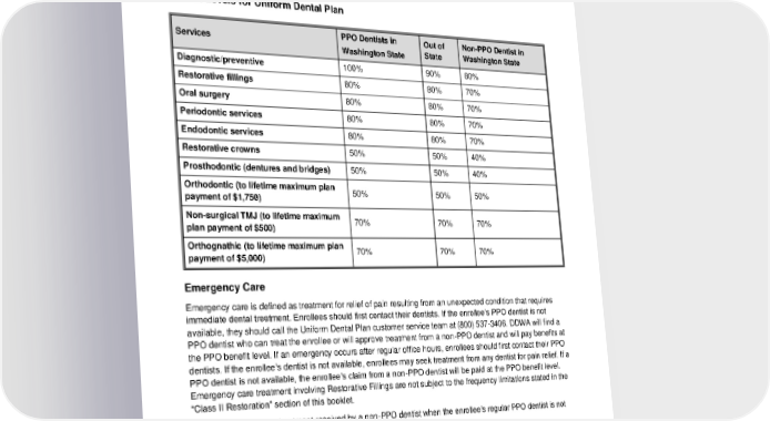 Specialty Services Specialty treatment is a covered benefit under the Uniform Dental Plan. As with all dental treatment, enrollees will receive a higher level of benefits if they obtain treatment from a PPO dentist. Enrollees may want to ask their dentists to refer them to PPO specialists in the event they need specialty care. PPO specialists are listed in the Uniform Dental Plan provider directory, or enrollees may contact the Uniform Dental Plan customer service team at (800) 537-3406. Benefit Levels for Uniform Dental Plan Services PPO Dentists in Out of Non-PPO Dentist in Washington State State Washington State Diagnostic/preventive 100% 90% 80% Restorative fillings 80% 80% 70% Oral surgery 80% 80% 70% Periodontic services 80% 80% 70% Endodontic services 80% 80% 70% Restorative crowns 50% 50% 40% Prosthodontic (dentures and bridges) 50% 50% 40% Orthodontic (to lifetime maximum plan 50% 50% 50% payment of $1,750) Non-surgical TMJ (to lifetime maximum 70% 70% 70% plan payment of $500) Orthognathic (to lifetime maximum plan 70% 70% 70% payment of $5,000) Emergency Care Emergency care is defined as treatment for relief of pain resulting from an unexpected condition that requires immediate dental treatment. Enrollees should first contact their dentists. If the enrollee’s PPO dentist is not available, they should call the Uniform Dental Plan customer service team at (800) 537-3406. DDWA will find a PPO dentist who can treat the enrollee or will approve treatment from a non-PPO dentist and will pay benefits at the PPO benefit level. If an emergency occurs after regular office hours, enrollees should first contact their PPO dentists. If the enrollee’s dentist is not available, enrollees may seek treatment from any dentist for pain relief. If a PPO dentist is not available, the enrollee’s claim from a non-PPO dentist will be paid at the PPO benefit level. Emergency care treatment involving Restorative Fillings are not subject to the frequency limitations stated in the “Class II Restoration” section of this booklet. Claims for emergency treatment received by a non-PPO dentist when the enrollee’s regular PPO dentist is not available must be sent with a written explanation to: Send your claim to: Delta Dental of Washington Customer Service Post Office Box 75983 Seattle, WA 98175-0983 2024-01-03000-BB 8 LG PPOL 20240101
