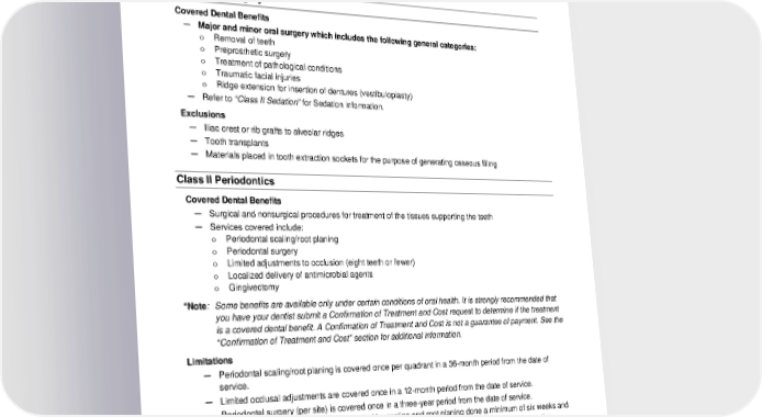 Please also see: — Refer to “Class III Restorative” for more information regarding coverage for crowns (other than stainless steel), inlays, veneers or onlays. *Limitations for Restorative fillings do not apply to treatment received due to an emergent care situation. Please refer to the “Emergency Care” section for more information. Class II Oral Surgery Covered Dental Benefits — Major and minor oral surgery which includes the following general categories: o Removal of teeth o Preprosthetic surgery o Treatment of pathological conditions o Traumatic facial injuries o Ridge extension for insertion of dentures (vestibuloplasty) — Refer to “Class II Sedation” for Sedation information. Exclusions — Iliac crest or rib grafts to alveolar ridges — Tooth transplants — Materials placed in tooth extraction sockets for the purpose of generating osseous filling Class II Periodontics Covered Dental Benefits — Surgical and nonsurgical procedures for treatment of the tissues supporting the teeth — Services covered include: o Periodontal scaling/root planing o Periodontal surgery o Limited adjustments to occlusion (eight teeth or fewer) o Localized delivery of antimicrobial agents o Gingivectomy *Note: Some benefits are available only under certain conditions of oral health. It is strongly recommended that you have your dentist submit a Confirmation of Treatment and Cost request to determine if the treatment is a covered dental benefit. A Confirmation of Treatment and Cost is not a guarantee of payment. See the “Confirmation of Treatment and Cost” section for additional information. Limitations — Periodontal scaling/root planing is covered once per quadrant in a 36-month period from the date of service. — Limited occlusal adjustments are covered once in a 12-month period from the date of service. — Periodontal surgery (per site) is covered once in a three-year period from the date of service. o Periodontal surgery must be preceded by scaling and root planing done a minimum of six weeks and a maximum of six months prior to treatment, or the patient must have been in active supportive periodontal therapy. — Soft tissue grafts (two sites per quadrant) are covered once in a three-year period from the date of service. — Localized delivery of antimicrobial agents is a Covered Dental Benefit under certain conditions of oral health, such as periodontal Pocket depth readings of 5mm or greater.* 2024-01-03000-BB 13 LG PPOL 20240101