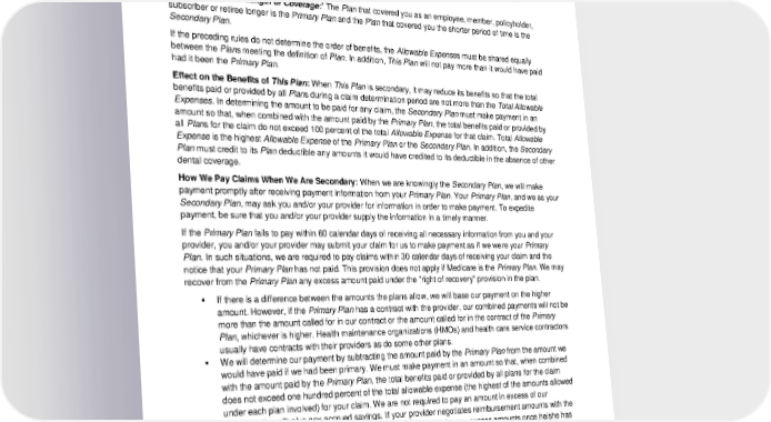 “COBRA or State Continuation Coverage:” If your coverage is provided under COBRA or under a right of continuation provided by state or other federal law is covered under another Plan, the Plan covering you as an employee, member, subscriber or retiree or covering you as a Dependent of an employee, member, subscriber or retiree is the Primary Plan and the COBRA or state or other federal continuation coverage is the Secondary Plan. If the other Plan does not have this rule, and as a result, the Plans do not agree on the order of benefits, this rule is ignored. This rule does not apply if the rule under the Non-Dependent or Dependent provision above can determine the order of benefits. “Longer or Shorter Length of Coverage:” The Plan that covered you as an employee, member, policyholder, subscriber or retiree longer is the Primary Plan and the Plan that covered you the shorter period of time is the Secondary Plan. If the preceding rules do not determine the order of benefits, the Allowable Expenses must be shared equally between the Plans meeting the definition of Plan. In addition, This Plan will not pay more than it would have paid had it been the Primary Plan. Effect on the Benefits of This Plan: When This Plan is secondary, it may reduce its benefits so that the total benefits paid or provided by all Plans during a claim determination period are not more than the Total Allowable Expenses. In determining the amount to be paid for any claim, the Secondary Plan must make payment in an amount so that, when combined with the amount paid by the Primary Plan, the total benefits paid or provided by all Plans for the claim do not exceed 100 percent of the total Allowable Expense for that claim. Total Allowable Expense is the highest Allowable Expense of the Primary Plan or the Secondary Plan. In addition, the Secondary Plan must credit to its Plan deductible any amounts it would have credited to its deductible in the absence of other dental coverage. How We Pay Claims When We Are Secondary: When we are knowingly the Secondary Plan, we will make payment promptly after receiving payment information from your Primary Plan. Your Primary Plan, and we as your Secondary Plan, may ask you and/or your provider for information in order to make payment. To expedite payment, be sure that you and/or your provider supply the information in a timely manner. If the Primary Plan fails to pay within 60 calendar days of receiving all necessary information from you and your provider, you and/or your provider may submit your claim for us to make payment as if we were your Primary Plan. In such situations, we are required to pay claims within 30 calendar days of receiving your claim and the notice that your Primary Plan has not paid. This provision does not apply if Medicare is the Primary Plan. We may recover from the Primary Plan any excess amount paid under the "right of recovery" provision in the plan. ▪ If there is a difference between the amounts the plans allow, we will base our payment on the higher amount. However, if the Primary Plan has a contract with the provider, our combined payments will not be more than the amount called for in our contract or the amount called for in the contract of the Primary Plan, whichever is higher. Health maintenance organizations (HMOs) and health care service contractors usually have contracts with their providers as do some other plans. ▪ We will determine our payment by subtracting the amount paid by the Primary Plan from the amount we would have paid if we had been primary. We must make payment in an amount so that, when combined with the amount paid by the Primary Plan, the total benefits paid or provided by all plans for the claim does not exceed one hundred percent of the total allowable expense (the highest of the amounts allowed under each plan involved) for your claim. We are not required to pay an amount in excess of our maximum benefit plus any accrued savings. If your provider negotiates reimbursement amounts with the plan(s) for the service provided, your provider may not bill you for any excess amounts once he/she has received payment for the highest of the negotiated amounts. When our deductible is fully credited, we will place any remaining amounts in a savings account to cover future claims which might not otherwise have been paid. 2024-01-03000-BB 34 LG PPOL 20240101