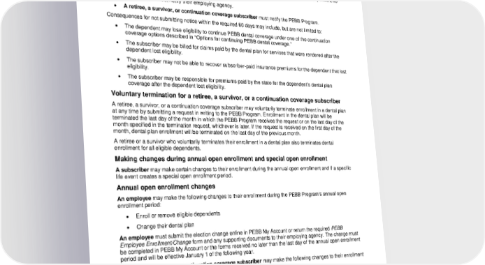 Making changes Removing a dependent who is no longer eligible A subscriber must provide notice to remove a dependent who is no longer eligible due to divorce, annulment, dissolution, or a qualifying event of a dependent ceasing to be eligible as a dependent child as described under “Dependent eligibility.” The notice must be received within 60 days of the last day of the month the dependent no longer meets the eligibility criteria. • An employee must notify their employing agency. • A retiree, a survivor, or continuation coverage subscriber must notify the PEBB Program. Consequences for not submitting notice within the required 60 days may include, but are not limited to: • The dependent may lose eligibility to continue PEBB dental coverage under one of the continuation coverage options described in “Options for continuing PEBB dental coverage.” • The subscriber may be billed for claims paid by the dental plan for services that were rendered after the dependent lost eligibility. • The subscriber may not be able to recover subscriber-paid insurance premiums for the dependent that lost eligibility. • The subscriber may be responsible for premiums paid by the state for the dependent’s dental plan coverage after the dependent lost eligibility. Voluntary termination for a retiree, a survivor, or a continuation coverage subscriber A retiree, a survivor, or a continuation coverage subscriber may voluntarily terminate enrollment in a dental plan at any time by submitting a request in writing to the PEBB Program. Enrollment in the dental plan will be terminated the last day of the month in which the PEBB Program receives the request or on the last day of the month specified in the termination request, whichever is later. If the request is received on the first day of the month, dental plan enrollment will be terminated on the last day of the previous month. A retiree or a survivor who voluntarily terminates their enrollment in a dental plan also terminates dental enrollment for all eligible dependents. Making changes during annual open enrollment and special open enrollment A subscriber may make certain changes to their enrollment during the annual open enrollment and if a specific life event creates a special open enrollment period. Annual open enrollment changes An employee may make the following changes to their enrollment during the PEBB Program’s annual open enrollment period: • Enroll or remove eligible dependents • Change their dental plan An employee must submit the election change online in PEBB My Account or return the required PEBB Employee Enrollment/Change form and any supporting documents to their employing agency. The change must be completed in PEBB My Account or the forms received no later than the last day of the annual open enrollment period and will be effective January 1 of the following year. A retiree, a survivor, or continuation coverage subscriber may make the following changes to their enrollment during the PEBB Program’s annual open enrollment period: • Enroll in or terminate enrollment in a dental plan • Enroll or remove eligible dependents • Change their dental plan A retiree, a survivor or continuation coverage subscriber must submit the election change online in PEBB My Account or return the required PEBB Retiree Change Form (form A-OE), PEBB Continuation Coverage (COBRA) 2024-01-03000-BB 24 LG PPOL 20240101