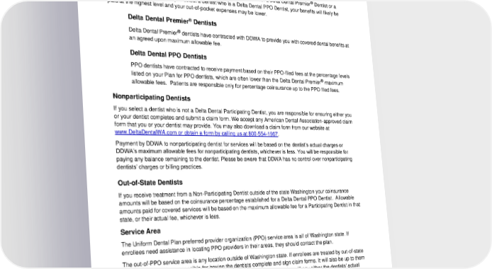 the Plan name and the group number. You will not have to hassle with sending in claim forms. Participating dentists complete claim forms and submit them directly to DDWA. They receive payment directly from DDWA. You will be responsible only for stated coinsurances, deductibles, any amount over the Plan maximum, and for any elective care you choose to receive outside the covered dental benefits. You will not be charged more than the participating dentist’s approved fee or the fee that the Delta Dental dentist has filed with us. ® There are two categories of Participating Dentists that you may choose: a Delta Dental Premier Dentist or a Delta Dental PPO Dentist. If you select a dentist who is a Delta Dental PPO Dentist, your benefits will likely be paid at the highest level and your out-of-pocket expenses may be lower. Delta Dental Premier® Dentists ® Delta Dental Premier dentists have contracted with DDWA to provide you with covered dental benefits at an agreed upon maximum allowable fee. Delta Dental PPO Dentists PPO dentists have contracted to receive payment based on their PPO-filed fees at the percentage levels ® listed on your Plan for PPO dentists, which are often lower than the Delta Dental Premier maximum allowable fees. Patients are responsible only for percentage coinsurance up to the PPO filed fees. Nonparticipating Dentists If you select a dentist who is not a Delta Dental Participating Dentist, you are responsible for ensuring either you or your dentist completes and submit a claim form. We accept any American Dental Association-approved claim form that you or your dentist may provide. You may also download a claim form from our website at www.DeltaDentalWA.com or obtain a form by calling us at 800-554-1907. Payment by DDWA to nonparticipating dentist for services will be based on the dentist’s actual charges or DDWA’s maximum allowable fees for nonparticipating dentists, whichever is less. You will be responsible for paying any balance remaining to the dentist. Please be aware that DDWA has no control over nonparticipating dentists’ charges or billing practices. Out-of-State Dentists If you receive treatment from a Non-Participating Dentist outside of the state Washington your coinsurance amounts will be based on the coinsurance percentage established for a Delta Dental PPO Dentist. Allowable amounts paid for covered services will be based on the maximum allowable fee for a Participating Dentist in that state, or their actual fee, whichever is less. Service Area The Uniform Dental Plan preferred provider organization (PPO) service area is all of Washington state. If enrollees need assistance in locating PPO providers in their areas, they should contact the plan. The out-of-PPO service area is any location outside of Washington state. If enrollees are treated by out-of-state dentists, they will be responsible for having the dentists complete and sign claim forms. It will also be up to them to ensure that the claims are sent to DDWA. For covered services, the plan will pay either the dentists’ actual charges or the maximum allowable fee normally paid to Delta Dental participating dentists for the same services, whichever is less. Uniform Dental Plan Providers Delta Dental of Washington has participating dentist contracts with nearly 3,400 licensed dentists in the state of Washington. 2024-01-03000-BB 6 LG PPOL 20240101