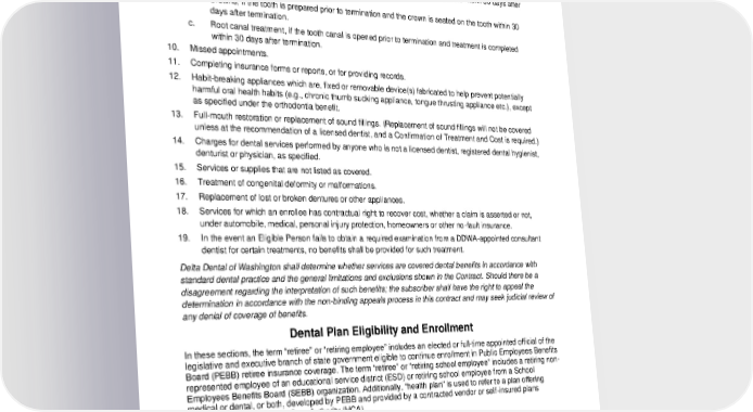 8. Services for accidental injury to natural teeth when evaluation of treatment and development of a written plan is performed more than 30 days from the date of injury. Treatment must be completed within the time frame established in the treatment plan unless delay is medically indicated and the written treatment plan is modified. 9. Expenses incurred after termination of coverage, except expenses for: a. Prosthetic devices that are fitted and ordered prior to termination and delivered within 30 days after termination. b. Crowns, if the tooth is prepared prior to termination and the crown is seated on the tooth within 30 days after termination. c. Root canal treatment, if the tooth canal is opened prior to termination and treatment is completed within 30 days after termination. 10. Missed appointments. 11. Completing insurance forms or reports, or for providing records. 12. Habit-breaking appliances which are, fixed or removable device(s) fabricated to help prevent potentially harmful oral health habits (e.g., chronic thumb sucking appliance, tongue thrusting appliance etc.), except as specified under the orthodontia benefit. 13. Full-mouth restoration or replacement of sound fillings. (Replacement of sound fillings will not be covered unless at the recommendation of a licensed dentist, and a Confirmation of Treatment and Cost is required.) 14. Charges for dental services performed by anyone who is not a licensed dentist, registered dental hygienist, denturist or physician, as specified. 15. Services or supplies that are not listed as covered. 16. Treatment of congenital deformity or malformations. 17. Replacement of lost or broken dentures or other appliances. 18. Services for which an enrollee has contractual right to recover cost, whether a claim is asserted or not, under automobile, medical, personal injury protection, homeowners or other no-fault insurance. 19. In the event an Eligible Person fails to obtain a required examination from a DDWA-appointed consultant dentist for certain treatments, no benefits shall be provided for such treatment. Delta Dental of Washington shall determine whether services are covered dental benefits in accordance with standard dental practice and the general limitations and exclusions shown in the Contract. Should there be a disagreement regarding the interpretation of such benefits; the subscriber shall have the right to appeal the determination in accordance with the non-binding appeals process in this contract and may seek judicial review of any denial of coverage of benefits. Dental Plan Eligibility and Enrollment In these sections, the term “retiree” or “retiring employee” includes an elected or full-time appointed official of the legislative and executive branch of state government eligible to continue enrollment in Public Employees Benefits Board (PEBB) retiree insurance coverage. The term “retiree” or “retiring school employee” includes a retiring non- represented employee of an educational service district (ESD) or retiring school employee from a School Employees Benefits Board (SEBB) organization. Additionally, “health plan” is used to refer to a plan offering medical or dental, or both, developed by PEBB and provided by a contracted vendor or self-insured plans administered by the Health Care Authority (HCA). Eligibility for subscribers and dependents Employee eligibility The employee’s state agency will inform the employee in writing whether or not they are eligible for PEBB benefits upon employment and whenever their eligibility status changes. The written notice will include information about the employee’s right to appeal eligibility and enrollment decisions. 2024-01-03000-BB 18 LG PPOL 20240101