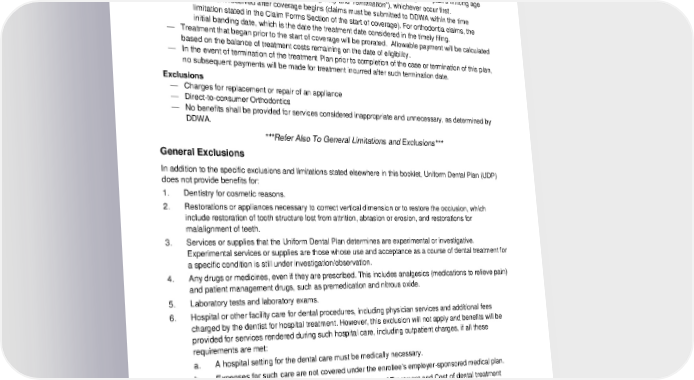 — Orthodontic records: exams (initial, periodic, comprehensive, detailed and extensive), X-rays (intraoral, extraoral, diagnostic radiographs, panoramic), diagnostic photographs, diagnostic casts (study models) or cephalometric films. Limitations — Payment is limited to: o Completion of the treatment plan, or any treatment that is completed through the plan’s limiting age for Orthodontics (refer to “Dependent Eligibility and Termination”), whichever occur first. o Treatment received after coverage begins (claims must be submitted to DDWA within the time limitation stated in the Claim Forms Section of the start of coverage). For orthodontia claims, the initial banding date, which is the date the treatment date considered in the timely filing. — Treatment that began prior to the start of coverage will be prorated. Allowable payment will be calculated based on the balance of treatment costs remaining on the date of eligibility. — In the event of termination of the treatment Plan prior to completion of the case or termination of this plan, no subsequent payments will be made for treatment incurred after such termination date. Exclusions — Charges for replacement or repair of an appliance — Direct-to-consumer Orthodontics — No benefits shall be provided for services considered inappropriate and unnecessary, as determined by DDWA. ***Refer Also To General Limitations and Exclusions*** General Exclusions In addition to the specific exclusions and limitations stated elsewhere in this booklet, Uniform Dental Plan (UDP) does not provide benefits for: 1. Dentistry for cosmetic reasons. 2. Restorations or appliances necessary to correct vertical dimension or to restore the occlusion, which include restoration of tooth structure lost from attrition, abrasion or erosion, and restorations for malalignment of teeth. 3. Services or supplies that the Uniform Dental Plan determines are experimental or investigative. Experimental services or supplies are those whose use and acceptance as a course of dental treatment for a specific condition is still under investigation/observation. 4. Any drugs or medicines, even if they are prescribed. This includes analgesics (medications to relieve pain) and patient management drugs, such as premedication and nitrous oxide. 5. Laboratory tests and laboratory exams. 6. Hospital or other facility care for dental procedures, including physician services and additional fees charged by the dentist for hospital treatment. However, this exclusion will not apply and benefits will be provided for services rendered during such hospital care, including outpatient charges, if all these requirements are met: a. A hospital setting for the dental care must be medically necessary. b. Expenses for such care are not covered under the enrollee’s employer-sponsored medical plan. c. Prior to hospitalization, a request for a Confirmation of Treatment and Cost of dental treatment performed at a hospital is submitted to and approved by DDWA. Such request for Confirmation of Treatment and Costs must be accompanied by a physician’s statement of medical necessity. If hospital or facility care is approved, available benefits will be provided at the same percentage rate as those performed by a participating dental provider, up to the available benefit maximum. 7. Dental services started prior to the date the person became eligible for services under this plan, except as provided for orthodontic benefits. 2024-01-03000-BB 17 LG PPOL 20240101