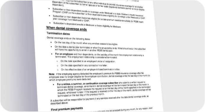 “Employer contribution” means contributions made by the dependent’s current or former employer toward health coverage as described in the Treasury Regulation. • Subscriber or their dependent has a change in enrollment under an employer-based group health plan during its annual open enrollment that does not align with the PEBB Program’s annual open enrollment. • Subscriber’s dependent has a change in residence from outside of the United States to within the United States, or from within the United States to outside of the United States and that change in residence resulted in the dependent losing their health insurance. • A court order requires the subscriber or any other individual to provide insurance coverage for an eligible dependent of the subscriber (a former spouse or former state-registered domestic partner is not an eligible dependent). • Subscriber or their dependent enrolls in coverage under Medicaid or a state Children’s Health Insurance Program (CHIP) or the subscriber or their dependent loses eligibility for coverage under Medicaid or CHIP. • Subscriber or their dependent becomes eligible for a state premium assistance subsidy for PEBB health plan coverage from Medicaid or CHIP. • Subscriber’s dependent enrolls in Medicare or loses eligibility for Medicare. When dental coverage ends Termination dates Dental coverage ends on the following dates: • On the last day of the month when any enrollee ceases to be eligible. • On the date a dental plan terminates or when the group policy ends. If that should occur, the subscriber will have the opportunity to enroll in another PEBB dental plan. • For an employee and their dependents, on the last day of the month the employment relationship is terminated. The employment relationship is considered terminated: o On the date specified in an employee’s letter of resignation. o On the date specified in any contract or hire letter. o On the effective date of an employer-initiated termination notice. Note: If the employing agency deducted the employee’s premium for PEBB insurance coverage after the employee was no longer eligible for the employer contribution, dental coverage ends the last day of the month for which employee premiums were deducted. • For a retiree, a survivor, or continuation coverage subscriber who submits a written request to terminate dental coverage, enrollment in dental coverage will be terminated the last day of the month in which the PEBB Program receives the request or on the last day of the month specified in the termination request, whichever is later. If the request is received on the first day of the month, dental coverage will be terminated on the last day of the previous month. A subscriber will be responsible for payment of any services received after the date dental coverage ends, as described above. Final premium payments Premium payments and applicable premium surcharges are not prorated during any month, for any reason, even if an enrollee dies or asks to terminate their dental plan before the end of the month. If the monthly premium or applicable premium surcharges remain unpaid for 30 days the account will be considered delinquent. A subscriber is allowed a grace period of 30 days from the date the monthly premiums or applicable premium surcharges become delinquent to pay the unpaid premium balance and applicable premium surcharges. If the subscriber’s premium balance or applicable premium surcharges remain unpaid for 60 days from the original due date, the subscriber’s dental coverage (including enrolled dependents) will be terminated retroactive to the last day of the month for which the monthly premiums and any applicable premium surcharges were paid. 2024-01-03000-BB 27 LG PPOL 20240101