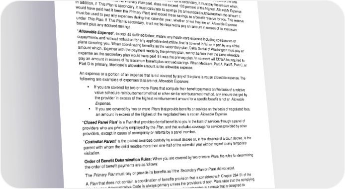 The order of benefit determination rules determine whether This Plan is a Primary Plan or Secondary Plan when you have dental coverage under more than one Plan. When This Plan is primary, it determines payment for its benefits first before those of any other Plan without considering any other Plan's benefits. When This Plan is secondary, it determines its benefits after those of another Plan and must make payment in an amount so that, when combined with the amount paid by the Primary Plan, the total benefits paid or provided by all Plans for the claim are coordinated up to 100 percent of the total Allowable Expense for that claim. This means that when This Plan is secondary, it must pay the amount which, when combined with what the Primary Plan paid, does not exceed 100 percent of the highest Allowable Expense. In addition, if This Plan is secondary, it must calculate its savings (its amount paid subtracted from the amount it would have paid had it been the Primary Plan) and record these savings as a benefit reserve for you. This reserve must be used to pay any expenses during that calendar year, whether or not they are an Allowable Expense under This Plan. If This Plan is secondary, it will not be required to pay an amount in excess of its maximum benefit plus any accrued savings. “Allowable Expense”, except as outlined below, means any health care expense including coinsurance or copayments and without reduction for any applicable deductible, that is covered in full or in part by any of the plans covering you. When coordinating benefits as the secondary plan, Delta Dental of Washington must pay an amount which, together with the payment made by the primary plan, cannot be less than the same allowable expense as the secondary plan would have paid if it was the primary plan. In no event will DDWA be required to pay an amount in excess of its maximum benefit plus accrued savings. When Medicare, Part A, Part B, Part C, or Part D is primary, Medicare’s allowable amount is the allowable expense. An expense or a portion of an expense that is not covered by any of the plans is not an allowable expense. The following are examples of expenses that are not Allowable Expenses: ▪ If you are covered by two or more Plans that compute their benefit payments on the basis of a relative value schedule reimbursement method or other similar reimbursement method, any amount charged by the provider in excess of the highest reimbursement amount for a specific benefit is not an Allowable Expense. ▪ If you are covered by two or more Plans that provide benefits or services on the basis of negotiated fees, an amount in excess of the highest of the negotiated fees is not an Allowable Expense. “Closed Panel Plan” is a Plan that provides dental benefits to you in the form of services through a panel of providers who are primarily employed by the Plan, and that excludes coverage for services provided by other providers, except in cases of emergency or referral by a panel member. “Custodial Parent” is the parent awarded custody by a court decree or, in the absence of a court decree, is the parent with whom the child resides more than one-half of the calendar year without regard to any temporary visitation. Order of Benefit Determination Rules: When you are covered by two or more Plans, the rules for determining the order of benefit payments are as follows: The Primary Plan must pay or provide its benefits as if the Secondary Plan or Plans did not exist. A Plan that does not contain a coordination of benefits provision that is consistent with Chapter 284-51 of the Washington Administrative Code is always primary unless the provisions of both Plans state that the complying Plan is primary, except coverage that is obtained by virtue of membership in a group that is designed to supplement a part of a basic package of benefits and provides that this supplementary coverage is excess to any other parts of the Plan provided by the contract holder. A Plan may consider the benefits paid or provided by another Plan in calculating payment of its benefits only when it is secondary to that other Plan. Each Plan determines its order of benefits using the first of the following rules that apply: 2024-01-03000-BB 32 LG PPOL 20240101