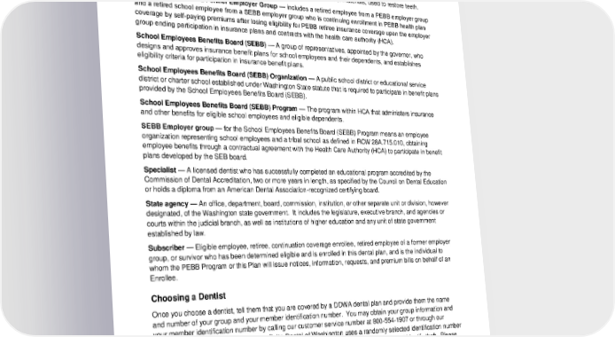 Public Employees Benefits Board (PEBB) — A group of representatives, appointed by the governor, who approves insurance benefit plans for employees and their dependents, and establishes eligibility criteria for participation in insurance benefit plans. Public Employees Benefits Board (PEBB) Program — The HCA program that administers PEBB benefit eligibility and enrollment. Resin-based Composite — Tooth-colored filling, made of a combination of materials, used to restore teeth. Retired Employee of a Former Employer Group — includes a retired employee from a PEBB employer group and a retired school employee from a SEBB employer group who is continuing enrollment in PEBB health plan coverage by self-paying premiums after losing eligibility for PEBB retiree insurance coverage upon the employer group ending participation in insurance plans and contracts with the health care authority (HCA). School Employees Benefits Board (SEBB) — A group of representatives, appointed by the governor, who designs and approves insurance benefit plans for school employees and their dependents, and establishes eligibility criteria for participation in insurance benefit plans. School Employees Benefits Board (SEBB) Organization — A public school district or educational service district or charter school established under Washington State statute that is required to participate in benefit plans provided by the School Employees Benefits Board (SEBB). School Employees Benefits Board (SEBB) Program — The program within HCA that administers insurance and other benefits for eligible school employees and eligible dependents. SEBB Employer group — for the School Employees Benefits Board (SEBB) Program means an employee organization representing school employees and a tribal school as defined in RCW 28A.715.010, obtaining employee benefits through a contractual agreement with the Health Care Authority (HCA) to participate in benefit plans developed by the SEB board. Specialist — A licensed dentist who has successfully completed an educational program accredited by the Commission of Dental Accreditation, two or more years in length, as specified by the Council on Dental Education or holds a diploma from an American Dental Association-recognized certifying board. State agency — An office, department, board, commission, institution, or other separate unit or division, however designated, of the Washington state government. It includes the legislature, executive branch, and agencies or courts within the judicial branch, as well as institutions of higher education and any unit of state government established by law. Subscriber — Eligible employee, retiree, continuation coverage enrollee, retired employee of a former employer group, or survivor who has been determined eligible and is enrolled in this dental plan, and is the individual to whom the PEBB Program or this Plan will issue notices, information, requests, and premium bills on behalf of an Enrollee. Choosing a Dentist Once you choose a dentist, tell them that you are covered by a DDWA dental plan and provide them the name and number of your group and your member identification number. You may obtain your group information and your member identification number by calling our customer service number at 800-554-1907 or through our website at www.DeltaDentalWA.com. Delta Dental of Washington uses a randomly selected identification number or universal identifiers to ensure the privacy of your information and to help protect against identify theft. Please note that ID cards are not required to see your dentist, but are provided for your convenience. Delta Dental Participating Dentists Delta Dental Participating Dentists have agreed to provide treatment for enrolled persons covered by DDWA plans. Just tell your dentist that you are covered by a DDWA dental Plan and provide your identification number, 2024-01-03000-BB 5 LG PPOL 20240101