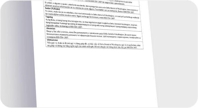 Taglines Russian Если у Вас или у лица, которому Вы помогаете, имеются вопросы относительно Delta Dental of Washington, то Вы имеете право на получение бесплатной помощи и информации на Вашем языке. Чтобы поговорить с переводчиком, позвоните по номеру 800-554-1907. Serbo-Croatian Ako vi, ili osoba kojoj pomažete, imate pitanja o kompaniji Delta Dental of Washington, imate pravo da potražite besplatnu pomoć i informacije na svom jeziku. Pozovite 800-554-1907 da razgovarate s prevodiocem. Spanish Si usted, o alguien a quien usted está ayudando, tiene preguntas acerca de Delta Dental of Washington, tiene derecho a obtener ayuda e información en su idioma sin costo alguno. Para hablar con un intérprete, llame al 800-554-1907. Sudan (Fulfulde) To onon, mala mo je on mballata, don mari emmmolji do Delta Dental of Washington, on mari jarfuye keɓɓugo wallende be matinolji be wolde moɗon mere. Ngam wolwugo be lornowo, ewne 800-554-1907. Tagalog Kung ikaw, o isang taong tinutulungan mo, ay may mga katanungan tungkol sa Delta Dental of Washington, mayroon kang karapatan humingi ng tulong at impormasyon sa iyong wika nang walang bayad. Upang makipag-usap sa isang tagasalin-wika, tumawag sa 800-554-1907. Ukrainian Якщо у Вас або у когось, кому Ви допомагаєте, є запитання щодо Delta Dental of Washington, Ви маєте право безкоштовно отримати допомогу та інформацію Вашою мовою. Щоб поговорити з перекладачем, телефонуйте за номером 800-554-1907. Vietnamese Nếu quý vị, hoặc ai đó mà quý vị đang giúp đỡ, có thắc mắc về Delta Dental of Washington, quý vị có quyền được nhận trợ giúp và thông tin bằng ngôn ngữ của mình miễn phí. Để nói chuyện với thông dịch viên, hãy gọi 800-554-1907. 2024-01-03000-BB 41 LG PPOL 20240101