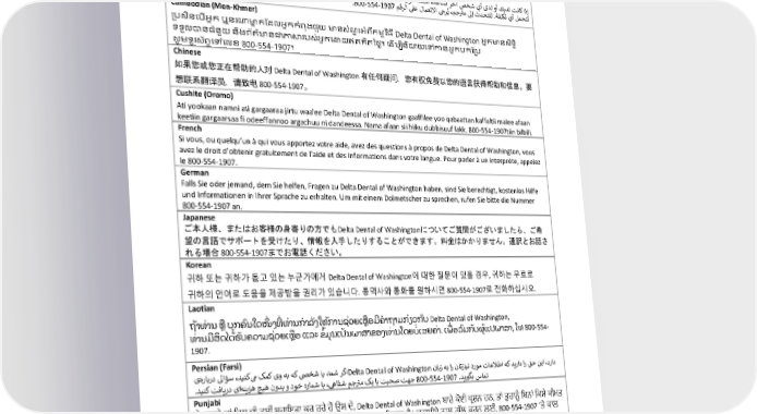 Taglines Amharic እርስዎ፣ ወይም ሌላ እየረዱት ያለ ሰው፣ ስለ Delta Dental of Washington ጥያቄ ካላችሁ፣ በራሳችሁ ቋንቋ ያለምንም ክፍያ እርዳታ እና መረጃ የማግኘት መብት አላችሁ። ከአስተርጓሚ ጋር ለማውራት፣ በ 800-554-1907 ይደውሉ። Arabic نأ نود كتغلب تامولعملاو ةدعاسملا بلط ف قحلا كلف ،Delta Dental of Washington لوح ةلئسأ هدعاست رخآ صخش يأ ىدل وأ كيدل تناك اذإ ي ُ ر . .800-554-1907 مقرلا لىع لاصتلاا جىري ،مجتم لىإ ثدحتلل ةفلكت يأ لمحتت Cambodian (Mon-Khmer) ិ ប្រសនិ បរអ្ើ នក ឬនរណា្⼫ន ក់ដែលអ្នកកពំ ុងជួយ ្⼫នសំណួ រអ្ពំ កី ម្មវធី Delta Dental of Washington អ្នក្⼫នសទ្ិ ធិ ទ្ទ្ួលបានជំនួយ និងពត័ ៌្⼫នជាភាសាររសអ្់ នកបោយឥតគតិ ថ្លៃ។ បែើម្បនី ិយាយបៅកាន់អ្នករកដប្រ សូម្ទ្ូរសព័ ទបៅបលខ 800-554-1907។ Chinese 如果您或您正在帮助的人对 Delta Dental of Washington 有任何疑问,您有权免费以您的语言获得帮助和信息。要 想联系翻译员,请致电 800-554-1907。 Cushite (Oromo) Ati yookaan namni ati gargaaraa jirtu waa'ee Delta Dental of Washington gaaffilee yoo qabaattan kaffaltii malee afaan keetiin gargaarsaa fi odeeffannoo argachuu ni dandeessa. Nama afaan sii hiiku dubbisuuf lakk. 800-554-1907tiin bilbili. French Si vous, ou quelqu’un à qui vous apportez votre aide, avez des questions à propos de Delta Dental of Washington, vous avez le droit d’obtenir gratuitement de l’aide et des informations dans votre langue. Pour parler à un interprète, appelez le 800-554-1907. German Falls Sie oder jemand, dem Sie helfen, Fragen zu Delta Dental of Washington haben, sind Sie berechtigt, kostenlos Hilfe und Informationen in Ihrer Sprache zu erhalten. Um mit einem Dolmetscher zu sprechen, rufen Sie bitte die Nummer 800-554-1907 an. Japanese ご本人様、またはお客様の身寄りの方でもDelta Dental of Washingtonについてご質問がございましたら、ご希 望の言語でサポートを受けたり、情報を入手したりすることができます。料金はかかりません。通訳とお話さ れる場合 800-554-1907までお電話ください。 Korean 귀하 또는 귀하가 돕고 있는 누군가에게 Delta Dental of Washington에 대한 질문이 있을 경우, 귀하는 무료로 귀하의 언어로 도움을 제공받을 권리가 있습니다. 통역사와 통화를 원하시면 800-554-1907로 전화하십시오. Laotian ່ ່ ຖາທານ ຫ ບກຄນໃດໜງທທານກາລງໃຫການຊວຍເຫ ອມຄາຖາມກຽວກບ Delta Dental of Washington, ຸ ້ ່ ່ ໍ ້ ່ ໍ ່ ຼື ຼື ົ ັ ັ ່ ້ ່ ທານມສດໄດຮບຄວາມຊວຍເຫ ອ ແລະ ຂມນເປນພາສາຂອງທານໂດຍບເສຍຄາ. ເພອລມກບຜແປພາສາ, ໂທ 800-554- ູ ູ ່ ້ ່ ໍ ັ ່ ໍ ່ ້ ິ ຼື ຼື ັ ົ ັ 1907. Persian (Farsi) یه رابرد لىاؤس ،دینکم کمک یو هب هک صیخش ای ،امش رگاDelta Dental of Washington نابز هب ار ناتزاین دروم تاعلاطا هک دیراد ار قح نیا ،دراد ر . . دینک تفایرد یاه نیزه چیه نودب و دوخ هرامش اب ،هیاف ش مجتم کی اب تبحص تهج 800-554-1907 دیتگب سامت ر Punjabi ਾਂ ਜੇ ਤੁਹਾਡੇ ਜਾ ਾਂ ਜਜਸ ਦੀ ਤੁਸੀ ਸਹਾਇਤਾ ਕਰ ਰਹੇ ਹੋ ਉਸ ਦੇ, Delta Dental of Washington ਬਾਰੇ ਕੋਈ ਪ੍ਰਸ਼ਨ ਹਨ, ਤਾਾਂ ਤੁਹਾਨੂੰ ਜਬਨਾਾਂ ਜਕਸੇ ਕੀਮਤ ਦੇ ਆਪ੍ਣੀ ਭਾਸ਼ਾ ਜਿਚ ਸਹਾਇਤਾ ਅਤੇ ਜਾਣਕਾਰੀ ਪ੍ਰਾਪ੍ਤ ਕਰਨ ਦਾ ਅਜਿਕਾਰ ਹੈ। ਦਭੁ ਾਸ਼ੀਏ ਨਾਲ ਗਲੱ ਕਰਨ ਲਈ, 800-554-1907 ‘ਤੇ ਕਾਲ ਕਰੋ। Romanian Dacă dumneavoastră sau o persoană pe care o asistați aveți întrebări despre Delta Dental of Washington, aveți dreptul de a obține gratuit ajutor și informații în limba dumneavoastră. Pentru a vorbi cu un interpret, sunați la 800-554-1907. 2024-01-03000-BB 40 LG PPOL 20240101