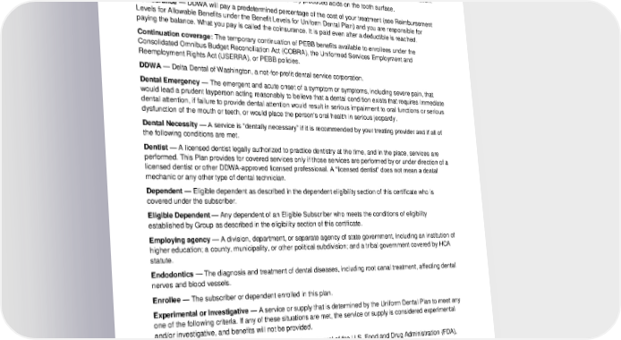 Appeal — An appeal is a written or oral request from an enrollee or, if authorized by the enrollee, the enrollee's representative to change a previous decision made by DDWA concerning: a) access to dental care benefits, including an adverse determination made pursuant to utilization review; b) claims handling, payment, or reimbursement for dental care and services; c) matters pertaining to the contractual relationship between an enrollee and DDWA or d) other matters as specifically required by state law or regulation. For an appeal related to PEBB eligibility or enrollment, see “Appeal Rights” in the “Eligibility and Enrollment” section for more information. Caries — Decay. A disease process initiated by bacterially produced acids on the tooth surface. Coinsurance — DDWA will pay a predetermined percentage of the cost of your treatment (see Reimbursement Levels for Allowable Benefits under the Benefit Levels for Uniform Dental Plan) and you are responsible for paying the balance. What you pay is called the coinsurance. It is paid even after a deductible is reached. Continuation coverage: The temporary continuation of PEBB benefits available to enrollees under the Consolidated Omnibus Budget Reconciliation Act (COBRA), the Uniformed Services Employment and Reemployment Rights Act (USERRA), or PEBB policies. DDWA — Delta Dental of Washington, a not-for-profit dental service corporation. Dental Emergency — The emergent and acute onset of a symptom or symptoms, including severe pain, that would lead a prudent layperson acting reasonably to believe that a dental condition exists that requires immediate dental attention, if failure to provide dental attention would result in serious impairment to oral functions or serious dysfunction of the mouth or teeth, or would place the person's oral health in serious jeopardy. Dental Necessity — A service is “dentally necessary” if it is recommended by your treating provider and if all of the following conditions are met. Dentist — A licensed dentist legally authorized to practice dentistry at the time, and in the place, services are performed. This Plan provides for covered services only if those services are performed by or under direction of a licensed dentist or other DDWA-approved licensed professional. A “licensed dentist” does not mean a dental mechanic or any other type of dental technician. Dependent — Eligible dependent as described in the dependent eligibility section of this certificate who is covered under the subscriber. Eligible Dependent — Any dependent of an Eligible Subscriber who meets the conditions of eligibility established by Group as described in the eligibility section of this certificate. Employing agency — A division, department, or separate agency of state government, including an institution of higher education; a county, municipality, or other political subdivision; and a tribal government covered by HCA statute. Endodontics — The diagnosis and treatment of dental diseases, including root canal treatment, affecting dental nerves and blood vessels. Enrollee — The subscriber or dependent enrolled in this plan. Experimental or Investigative — A service or supply that is determined by the Uniform Dental Plan to meet any one of the following criteria. If any of these situations are met, the service or supply is considered experimental and/or investigative, and benefits will not be provided. 1. It cannot be lawfully marketed without the approval of the U.S. Food and Drug Administration (FDA), and such approval has not been granted on the date it is furnished. 2. The provider has not demonstrated proficiency in the service, based on knowledge, training, experience, and treatment outcomes. 3. Reliable evidence shows the service is the subject of ongoing clinical trials to determine its safety or effectiveness. 2024-01-03000-BB 2 LG PPOL 20240101