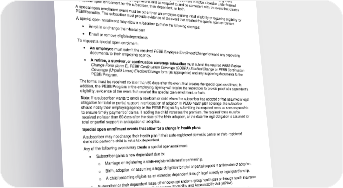 Election/Change, or PEBB Continuation Coverage (Unpaid Leave) Election/Change form (as appropriate) and any supporting documents to the PEBB Program. The change must be completed in PEBB My Account or the forms received no later than the last day of the annual open enrollment period and will be effective January 1 of the following year. Special open enrollment changes A subscriber may change their enrollment outside of the annual open enrollment period if a qualifying event creates a special open enrollment period. However, the change in enrollment must be allowable under Internal Revenue Code (IRC) and Treasury Regulations and correspond to and be consistent with the event that creates the special open enrollment for the subscriber, their dependent, or both. A special open enrollment event must be other than an employee gaining initial eligibility or regaining eligibility for PEBB benefits. The subscriber must provide evidence of the event that created the special open enrollment. A special open enrollment may allow a subscriber to make the following changes: • Enroll in or change their dental plan • Enroll or remove eligible dependents To request a special open enrollment: • An employee must submit the required PEBB Employee Enrollment/Change form and any supporting documents to their employing agency. • A retiree, a survivor, or continuation coverage subscriber must submit the required PEBB Retiree Change Form (form E), PEBB Continuation Coverage (COBRA) Election/Change, or PEBB Continuation Coverage (Unpaid Leave) Election/Change form (as appropriate) and any supporting documents to the PEBB Program. The forms must be received no later than 60 days after the event that creates the special open enrollment. In addition, the PEBB Program or the employing agency will require the subscriber to provide proof of a dependent’s eligibility, evidence of the event that created the special open enrollment, or both. Note: If a subscriber wants to enroll a newborn or child whom the subscriber has adopted or has assumed a legal obligation for total or partial support in anticipation of adoption in PEBB health plan coverage, the subscriber should notify their employing agency or the PEBB Program by submitting the required forms as soon as possible to ensure timely payment of claims. If adding the child increases the premium, the required forms must be received no later than 60 days after the date of the birth, adoption, or the date the legal obligation is assumed for total or partial support in anticipation of adoption. Special open enrollment events that allow for a change in health plans A subscriber may not change their health plan if their state-registered domestic partner or state-registered domestic partner’s child is not a tax dependent. Any of the following events may create a special open enrollment: • Subscriber gains a new dependent due to: o Marriage or registering a state-registered domestic partnership. o Birth, adoption, or assuming a legal obligation for total or partial support in anticipation of adoption. o A child becoming eligible as an extended dependent through legal custody or legal guardianship. • Subscriber or their dependent loses other coverage under a group health plan or through health insurance coverage, as defined by the Health Insurance Portability and Accountability Act (HIPAA). • Subscriber has a change in employment status that affects their eligibility for the employer contribution toward their employer-based group health plan. • Subscriber’s dependent has a change in their own employment status that affects their eligibility or their dependent’s eligibility for the employer contribution under their employer-based group health plan. “Employer contribution” means contributions made by the dependent’s current or former employer toward health coverage as described in the Treasury Regulation. 2024-01-03000-BB 25 LG PPOL 20240101