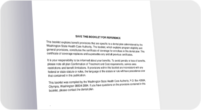SAVE THIS BOOKLET FOR REFERENCE This booklet explains benefit provisions that are specific to a dental plan administered by the Washington State Health Care Authority. The booklet, which explains program eligibility and general provisions, constitutes the certificate of coverage for enrollees in this dental plan. This certificate of coverage replaces and supersedes any and all previous certificates. It is your responsibility to be informed about your benefits. To avoid penalty or loss of benefits, please note all plan Confirmation of Treatment and Cost requirements, service area restrictions and benefit limitations. If provisions within this booklet are inconsistent with any federal or state statute or rules, the language of the statute or rule will have precedence over that contained in this publication. This booklet was compiled by the Washington State Health Care Authority, P.O. Box 42684, Olympia, Washington 98504-2684. If you have questions on the provisions contained in this booklet, please contact the dental plan. . 2024-01-03000-BB LG PPOL 20240101