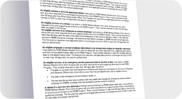 the election period ends as described above. For more information, see “Options for continuing PEBB dental coverage” and the PEBB Continuation Coverage Election Notice. Retiree and survivor enrollment An eligible retiree, a survivor, or their dependent can enroll in only one PEBB dental plan, even if eligibility criteria is met under two or more subscribers. An eligible retiring employee or a retiring school employee must submit a PEBB Retiree Election Form (form A) along with any other required forms and supporting documents to the PEBB Program. They must be received no later than 60 days after the employee’s or the school employee’s employer-paid coverage, COBRA coverage, or continuation coverage ends. The first premium payment and applicable premium surcharges are due to HCA no later than 45 days after the election period ends. An eligible elected or full-time appointed official must submit a PEBB Retiree Election Form (form A) along with any other required forms and supporting documents to the PEBB Program. They must be received no later than 60 days after the official leaves public office. The first premium payment and applicable premium surcharges are due to HCA no later than 45 days after the election period ends. An eligible survivor of a retiree must submit a PEBB Retiree Election Form (form A) along with any other required forms and supporting documents to the PEBB Program. They must be received no later than 60 days after the death of the retiree. An eligible survivor of an employee or school employee must submit a PEBB Retiree Election Form (form A) along with any other required forms and supporting documents to the PEBB Program. They must be received no later than 60 days after the later of the date of the employee’s or the school employee’s death, or the date the survivor’s PEBB insurance coverage, educational service district coverage, or SEBB insurance coverage ends. The first premium payment and applicable premium surcharges are due to HCA no later than 45 days after the election period ends. An eligible employee or school employee determined to be retroactively eligible for disability retirement must submit a PEBB Retiree Election Form (form A) along with any other required forms, supporting documents, and their formal determination letter to the PEBB Program. They must be received no later than 60 days after the date on the determination letter. The first premium payment and applicable premium surcharges are due to HCA no later than 45 days after the election period ends. An eligible survivor of an emergency service personnel killed in the line of duty must submit a PEBB Retiree Election Form (form A) along with any other required forms and supporting documents to the PEBB Program. They must be received no later than 180 days after the later of: • The date on the letter from the Department of Retirement Systems or the Board for Volunteer Firefighters and Reserve Officers that informs the survivor that they are determined to be an eligible survivor; • The date of the emergency service worker’s death; or • The last day the survivor was covered under any health plan through the emergency service worker’s employer or COBRA coverage from the emergency service worker’s employer. A retiree or a survivor who deferred enrollment and is enrolling in a PEBB retiree health plan, must submit a PEBB Retiree Election Form (form A) along with any other required forms, supporting documents, and evidence of continuous enrollment to the PEBB Program. They must be received no later than 60 days after a loss of other qualifying coverage. The first premium payment and applicable premium surcharges are due to HCA no later than 45 days after the election period ends. Dependent enrollment If a retiree or a survivor chooses to enroll in a dental plan under PEBB retiree insurance coverage, any dependents enrolled on the retiree or survivor’s account will also be enrolled in dental coverage. If a subscriber chooses to enroll an eligible dependent, the subscriber must include the dependent’s information on the applicable enrollment form and provide the required document(s) as proof of the dependent’s eligibility. The dependent will not be enrolled in PEBB health plan coverage if the PEBB Program or the employing agency is unable to verify their eligibility within the PEBB Program enrollment timelines. 2024-01-03000-BB 21 LG PPOL 20240101