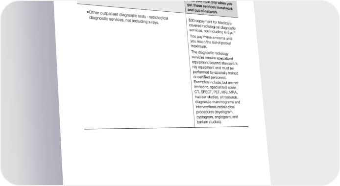 2024 Evidence of Coverage for UnitedHealthcare® Group Medicare Advantage PEBB Balance (PPO) Chapter 4: Medical Benefits Chart (what is covered and what you pay) 107 Services that are covered for you What you must pay when you get these services in-network and out-of-network · Other outpatient diagnostic tests - radiological $30 copayment for Medicare- diagnostic services, not including x-rays. covered radiological diagnostic services, not including X-rays.†† You pay these amounts until you reach the out-of-pocket maximum. The diagnostic radiology services require specialized equipment beyond standard X- ray equipment and must be performed by specially trained or certified personnel. Examples include, but are not limited to, specialized scans, CT, SPECT, PET, MRI, MRA, nuclear studies, ultrasounds, diagnostic mammograms and interventional radiological procedures (myelogram, cystogram, angiogram, and barium studies).