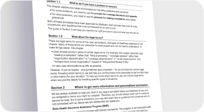 2024 Evidence of Coverage for UnitedHealthcare® Group Medicare Advantage PEBB Balance (PPO) Chapter 9: What to do if you have a problem or complaint (coverage decisions, appeals, complaints) 196 Section 1 Introduction Section 1.1 What to do if you have a problem or concern This chapter explains two types of processes for handling problems and concerns: · For some problems, you need to use the process for coverage decisions and appeals. · For other problems, you need to use the process for making complaints; also called grievances. Both of these processes have been approved by Medicare. Each process has a set of rules, procedures, and deadlines that must be followed by us and by you. The guide in Section 3 will help you identify the right process to use and what you should do. Section 1.2 What about the legal terms? There are legal terms for some of the rules, procedures, and types of deadlines explained in this chapter. Many of these terms are unfamiliar to most people and can be hard to understand. To make things easier, this chapter: · Uses simpler words in place of certain legal terms. For example, this chapter generally says “making a complaint” rather than “filing a grievance,” “coverage decision” rather than “organization determination” or “coverage determination” or “at-risk determination” and “independent review organization” instead of “Independent Review Entity.” · It also uses abbreviations as little as possible. However, it can be helpful – and sometimes quite important – for you to know the correct legal terms. Knowing which terms to use will help you communicate more accurately to get the right help or information for your situation. To help you know which terms to use, we include legal terms when we give the details for handling specific types of situations. Section 2 Where to get more information and personalized assistance We are always available to help you. Even if you have a complaint about our treatment of you, we are obligated to honor your right to complain. Therefore, you should always reach out to customer service for help. But in some situations, you may also want help or guidance from someone who is not connected with us. Below are two entities that can assist you. State Health Insurance Assistance Program (SHIP) Each state has a government program with trained counselors. The program is not connected with us or with any insurance company or health plan. The counselors at this program can help you understand which process you should use to handle a problem you are having. They can also answer your questions, give you more information, and offer guidance on what to do. The services of SHIP counselors are free. You will find phone numbers in Chapter 2, Section 3 of this document.
