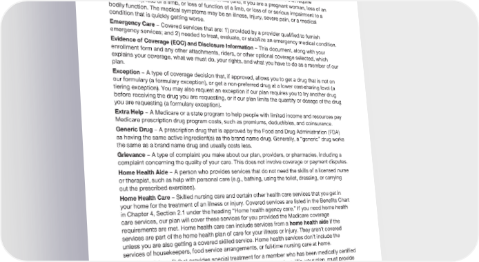 2024 Evidence of Coverage for UnitedHealthcare® Group Medicare Advantage PEBB Balance (PPO) Chapter 12: Definitions of important words 252 Emergency – A medical emergency is when you, or any other prudent layperson with an average knowledge of health and medicine, believe that you have medical symptoms that require immediate medical attention to prevent loss of life (and, if you are a pregnant woman, loss of an unborn child), loss of a limb, or loss of function of a limb, or loss of or serious impairment to a bodily function. The medical symptoms may be an illness, injury, severe pain, or a medical condition that is quickly getting worse. Emergency Care – Covered services that are: 1) provided by a provider qualified to furnish emergency services; and 2) needed to treat, evaluate, or stabilize an emergency medical condition. Evidence of Coverage (EOC) and Disclosure Information – This document, along with your enrollment form and any other attachments, riders, or other optional coverage selected, which explains your coverage, what we must do, your rights, and what you have to do as a member of our plan. Exception – A type of coverage decision that, if approved, allows you to get a drug that is not on our formulary (a formulary exception), or get a non-preferred drug at a lower cost-sharing level (a tiering exception). You may also request an exception if our plan requires you to try another drug before receiving the drug you are requesting, or if our plan limits the quantity or dosage of the drug you are requesting (a formulary exception). Extra Help – A Medicare or a state program to help people with limited income and resources pay Medicare prescription drug program costs, such as premiums, deductibles, and coinsurance. Generic Drug – A prescription drug that is approved by the Food and Drug Administration (FDA) as having the same active ingredient(s) as the brand name drug. Generally, a “generic” drug works the same as a brand name drug and usually costs less. Grievance – A type of complaint you make about our plan, providers, or pharmacies, including a complaint concerning the quality of your care. This does not involve coverage or payment disputes. Home Health Aide – A person who provides services that do not need the skills of a licensed nurse or therapist, such as help with personal care (e.g., bathing, using the toilet, dressing, or carrying out the prescribed exercises). Home Health Care – Skilled nursing care and certain other health care services that you get in your home for the treatment of an illness or injury. Covered services are listed in the Benefits Chart in Chapter 4, Section 2.1 under the heading “Home health agency care.” If you need home health care services, our plan will cover these services for you provided the Medicare coverage requirements are met. Home health care can include services from a home health aide if the services are part of the home health plan of care for your illness or injury. They aren’t covered unless you are also getting a covered skilled service. Home health services don’t include the services of housekeepers, food service arrangements, or full-time nursing care at home. Hospice – A benefit that provides special treatment for a member who has been medically certified as terminally ill, meaning having a life expectancy of 6 months or less. We, your plan, must provide you with a list of hospices in your geographic area. If you elect hospice and continue to pay premiums you are still a member of our plan. You can still obtain all medically necessary services as well as the supplemental benefits we offer. Hospice Care – A special way of caring for people who are terminally ill and providing counseling for their families. Hospice care is physical care and counseling that is given by a team of people