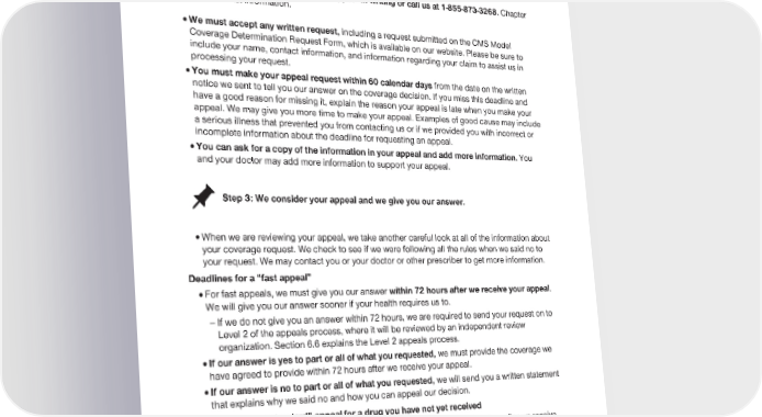 2024 Evidence of Coverage for UnitedHealthcare® Group Medicare Advantage PEBB Balance (PPO) Chapter 9: What to do if you have a problem or complaint (coverage decisions, appeals, complaints) 213 · For fast appeals either submit your appeal in writing or call us at 1-855-873-3268. Chapter 2 has contact information. · We must accept any written request, including a request submitted on the CMS Model Coverage Determination Request Form, which is available on our website. Please be sure to include your name, contact information, and information regarding your claim to assist us in processing your request. · You must make your appeal request within 60 calendar days from the date on the written notice we sent to tell you our answer on the coverage decision. If you miss this deadline and have a good reason for missing it, explain the reason your appeal is late when you make your appeal. We may give you more time to make your appeal. Examples of good cause may include a serious illness that prevented you from contacting us or if we provided you with incorrect or incomplete information about the deadline for requesting an appeal. · You can ask for a copy of the information in your appeal and add more information. You and your doctor may add more information to support your appeal. Step 3: We consider your appeal and we give you our answer. · When we are reviewing your appeal, we take another careful look at all of the information about your coverage request. We check to see if we were following all the rules when we said no to your request. We may contact you or your doctor or other prescriber to get more information. Deadlines for a “fast appeal” · For fast appeals, we must give you our answer within 72 hours after we receive your appeal. We will give you our answer sooner if your health requires us to. - If we do not give you an answer within 72 hours, we are required to send your request on to Level 2 of the appeals process, where it will be reviewed by an independent review organization. Section 6.6 explains the Level 2 appeals process. · If our answer is yes to part or all of what you requested, we must provide the coverage we have agreed to provide within 72 hours after we receive your appeal. · If our answer is no to part or all of what you requested, we will send you a written statement that explains why we said no and how you can appeal our decision. Deadlines for a “standard” appeal for a drug you have not yet received · For standard appeals, we must give you our answer within 7 calendar days after we receive your appeal. We will give you our decision sooner if you have not received the drug yet and your health condition requires us to do so. - If we do not give you a decision within 7 calendar days, we are required to send your request on to Level 2 of the appeals process, where it will be reviewed by an independent review organization. Section 6.6 explains the Level 2 appeal process.