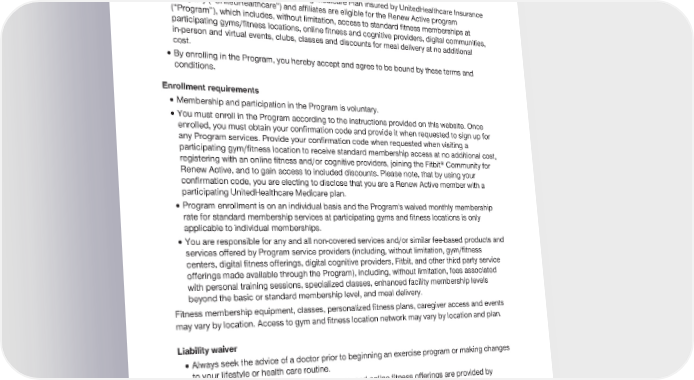 2024 Evidence of Coverage for UnitedHealthcare® Group Medicare Advantage PEBB Balance (PPO) Chapter 11: Legal notices 246 Eligibility requirements · Only members enrolled in a participating Medicare Plan insured by UnitedHealthcare Insurance Company (“UnitedHealthcare") and affiliates are eligible for the Renew Active program (“Program”), which includes, without limitation, access to standard fitness memberships at participating gyms/fitness locations, online fitness and cognitive providers, digital communities, in-person and virtual events, clubs, classes and discounts for meal delivery at no additional cost. · By enrolling in the Program, you hereby accept and agree to be bound by these terms and conditions. Enrollment requirements · Membership and participation in the Program is voluntary. · You must enroll in the Program according to the instructions provided on this website. Once enrolled, you must obtain your confirmation code and provide it when requested to sign up for any Program services. Provide your confirmation code when requested when visiting a participating gym/fitness location to receive standard membership access at no additional cost, registering with an online fitness and/or cognitive providers, joining the Fitbit® Community for Renew Active, and to gain access to included discounts. Please note, that by using your confirmation code, you are electing to disclose that you are a Renew Active member with a participating UnitedHealthcare Medicare plan. · Program enrollment is on an individual basis and the Program's waived monthly membership rate for standard membership services at participating gyms and fitness locations is only applicable to individual memberships. · You are responsible for any and all non-covered services and/or similar fee-based products and services offered by Program service providers (including, without limitation, gym/fitness centers, digital fitness offerings, digital cognitive providers, Fitbit, and other third party service offerings made available through the Program), including, without limitation, fees associated with personal training sessions, specialized classes, enhanced facility membership levels beyond the basic or standard membership level, and meal delivery. Fitness membership equipment, classes, personalized fitness plans, caregiver access and events may vary by location. Access to gym and fitness location network may vary by location and plan. Liability waiver · Always seek the advice of a doctor prior to beginning an exercise program or making changes to your lifestyle or health care routine. · Certain services, discounts, classes, events, and online fitness offerings are provided by affiliates of UnitedHealthcare or other third parties not affiliated with UnitedHealthcare. Participation in these third-party services are subject to your acceptance of their respective terms and policies. UnitedHealthcare and its respective subsidiaries are not responsible for the services or information provided by third parties. The information provided through these services is for informational purposes only and is not a substitute for the advice of a doctor. UnitedHealthcare and its respective subsidiaries and affiliates do not endorse and are not