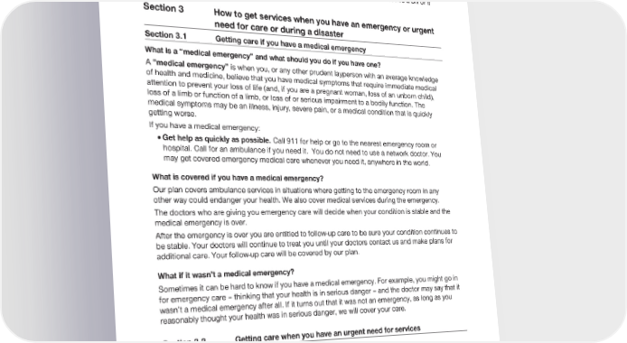 2024 Evidence of Coverage for UnitedHealthcare® Group Medicare Advantage PEBB Balance (PPO) Chapter 3: Using the plan for your medical services 65 for payment. See Chapter 7 (Asking us to pay our share of a bill you have received for covered medical services or drugs) for information about what to do if you receive a bill or if you need to ask for reimbursement. Section 3 How to get services when you have an emergency or urgent need for care or during a disaster Section 3.1 Getting care if you have a medical emergency What is a “medical emergency” and what should you do if you have one? A “medical emergency” is when you, or any other prudent layperson with an average knowledge of health and medicine, believe that you have medical symptoms that require immediate medical attention to prevent your loss of life (and, if you are a pregnant woman, loss of an unborn child), loss of a limb or function of a limb, or loss of or serious impairment to a bodily function. The medical symptoms may be an illness, injury, severe pain, or a medical condition that is quickly getting worse. If you have a medical emergency: · Get help as quickly as possible. Call 911 for help or go to the nearest emergency room or hospital. Call for an ambulance if you need it. You do not need to use a network doctor. You may get covered emergency medical care whenever you need it, anywhere in the world. What is covered if you have a medical emergency? Our plan covers ambulance services in situations where getting to the emergency room in any other way could endanger your health. We also cover medical services during the emergency. The doctors who are giving you emergency care will decide when your condition is stable and the medical emergency is over. After the emergency is over you are entitled to follow-up care to be sure your condition continues to be stable. Your doctors will continue to treat you until your doctors contact us and make plans for additional care. Your follow-up care will be covered by our plan. What if it wasn’t a medical emergency? Sometimes it can be hard to know if you have a medical emergency. For example, you might go in for emergency care – thinking that your health is in serious danger – and the doctor may say that it wasn’t a medical emergency after all. If it turns out that it was not an emergency, as long as you reasonably thought your health was in serious danger, we will cover your care. Section 3.2 Getting care when you have an urgent need for services What are “urgently needed services”? An urgently needed service is a non-emergency situation requiring immediate medical care but, given your circumstances, it is not possible or not reasonable to obtain these services from a network provider. The plan must cover urgently needed services provided out-of-network. Some examples of urgently needed services are i) a severe sore throat that occurs over the weekend or ii) an unforeseen flare-up of a known condition when you are temporarily outside the service area.